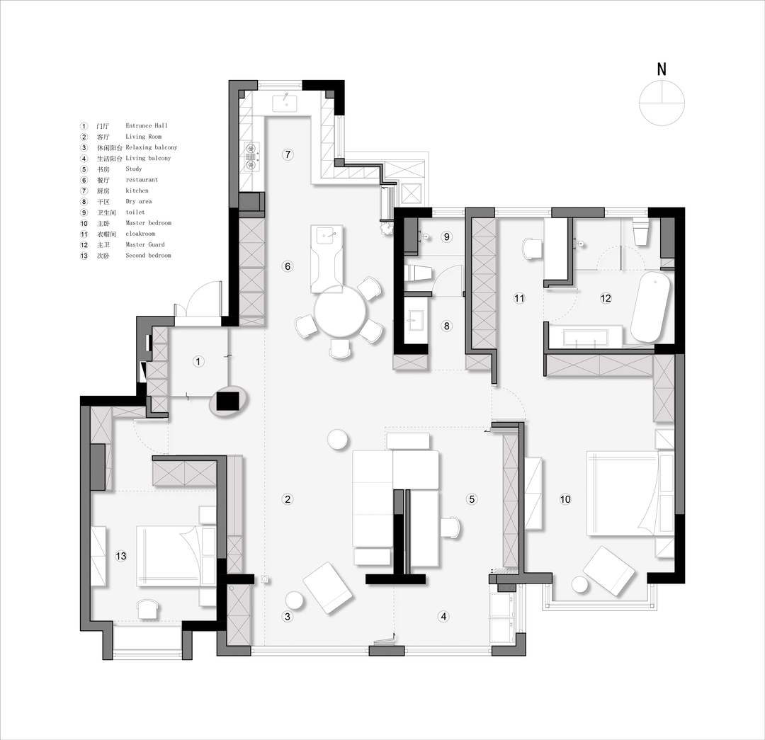 ✨将主卧和北次卧合成一个大套间,涵盖睡眠、衣帽、盥洗等功能。改变主卫的进入方向,从原北次卧(11)进入并借用部分空间,做到拥有双台盆、独立淋浴间、独立马桶间和浴缸的宽敞主卫。先前的主卫干区台盆则做成了L型衣帽间,再加上(11)区域的整排收纳柜,满足了两位业主的所有衣物摆放。��������