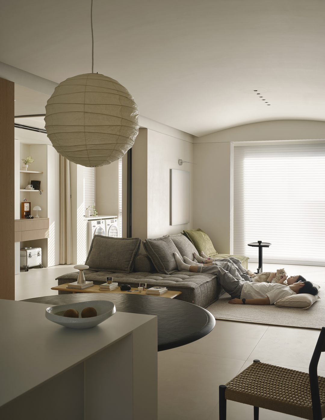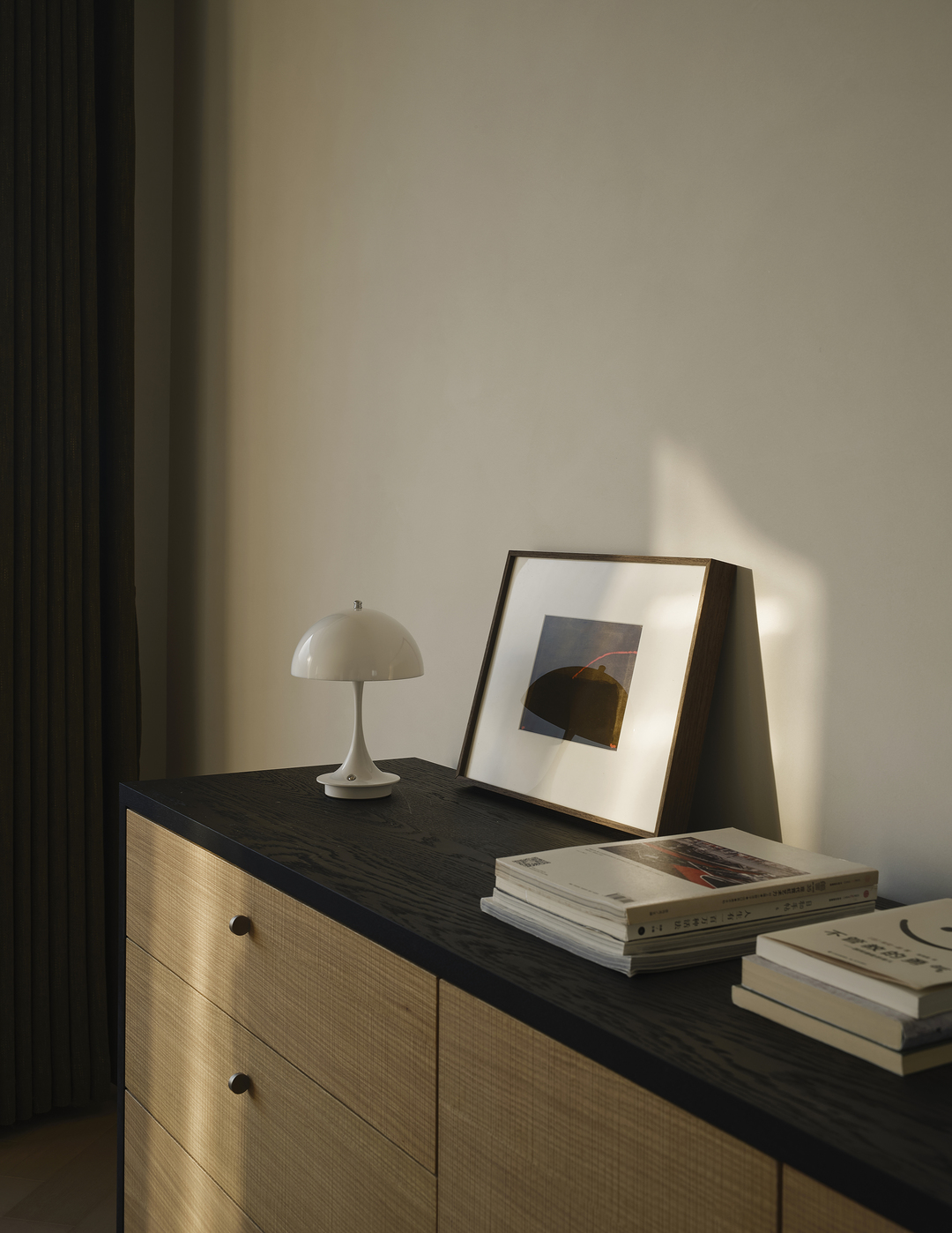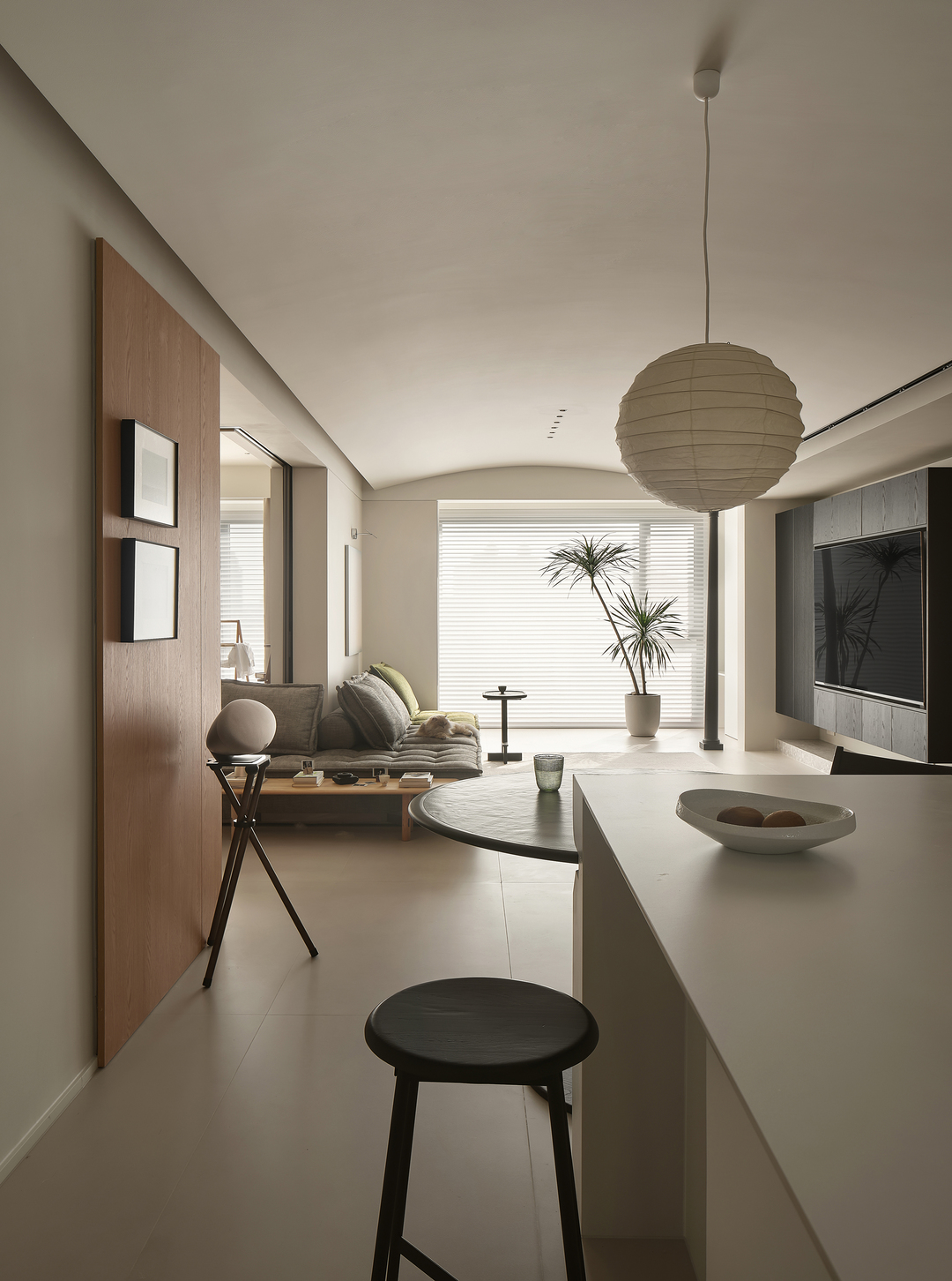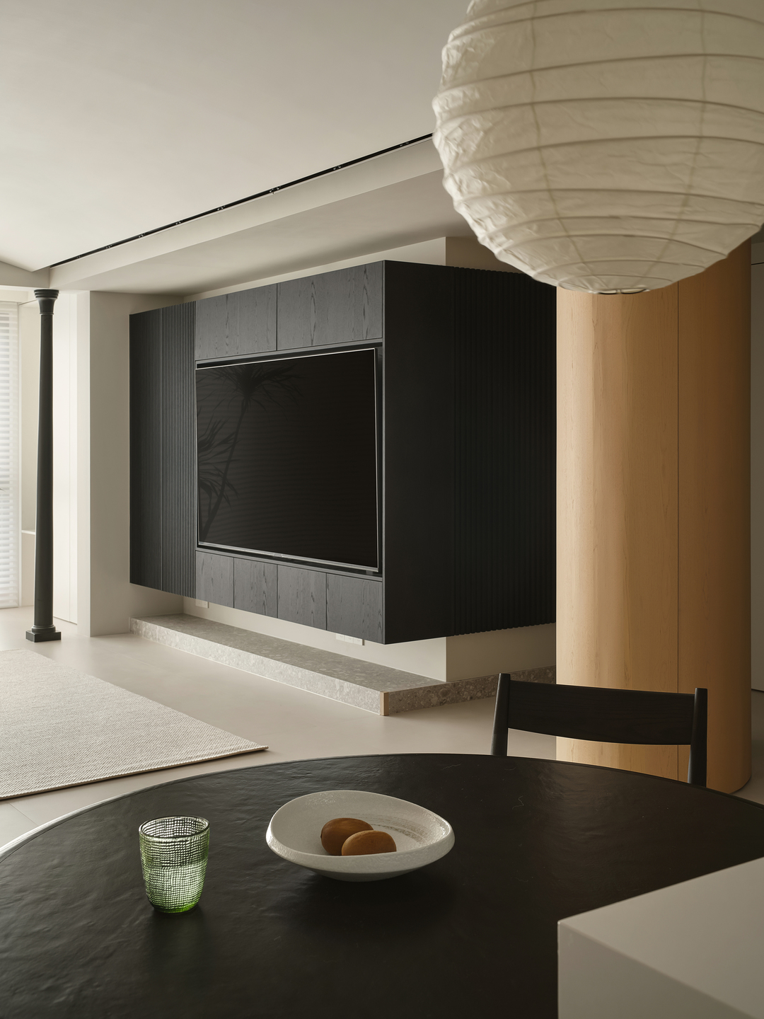 正前方的圆形壁灯与掀起的白色折页形成具有仪式感的组合,温暖的灯光晕染在黑色格珊之上,闲适细腻的归家氛围就此渲染开来。