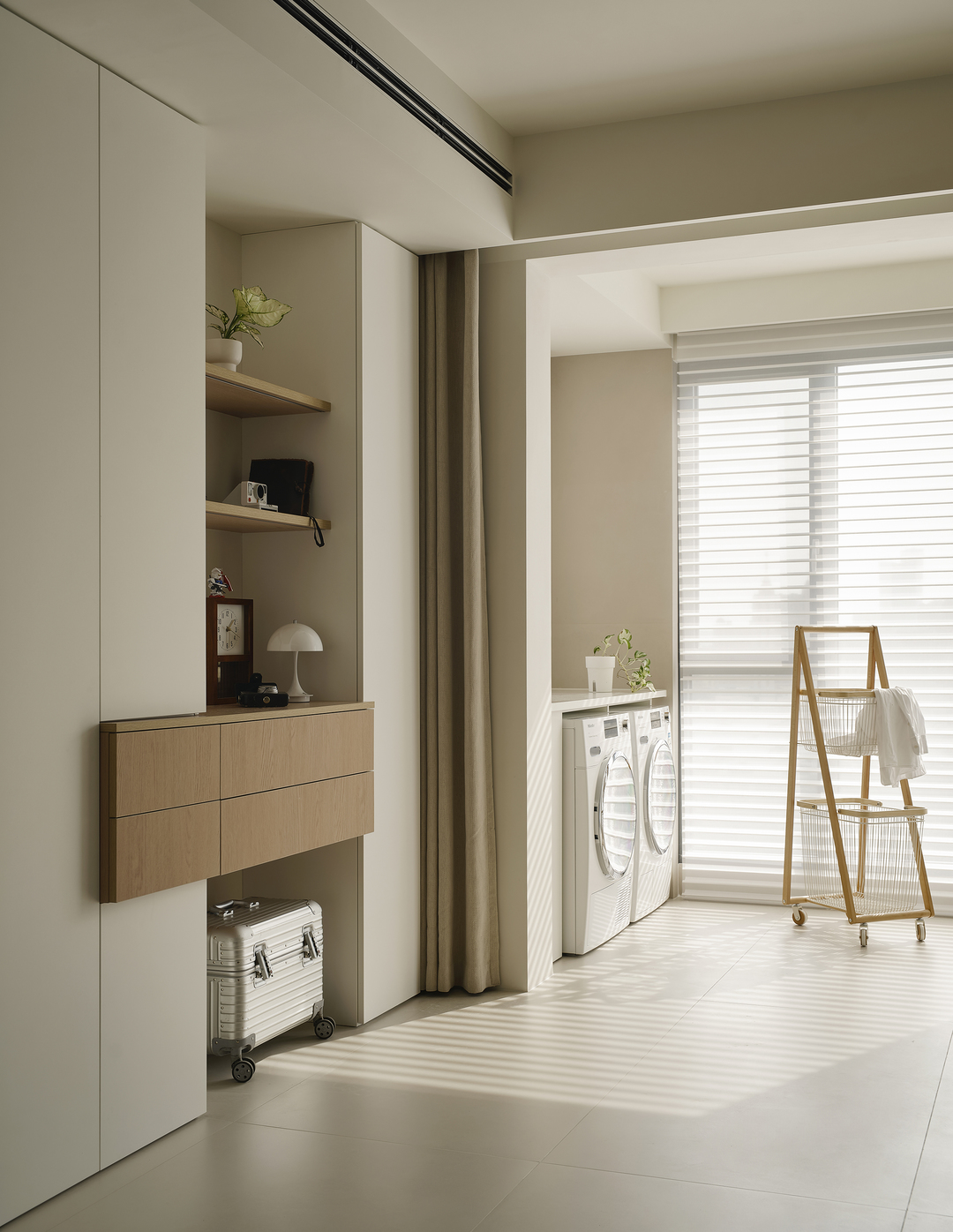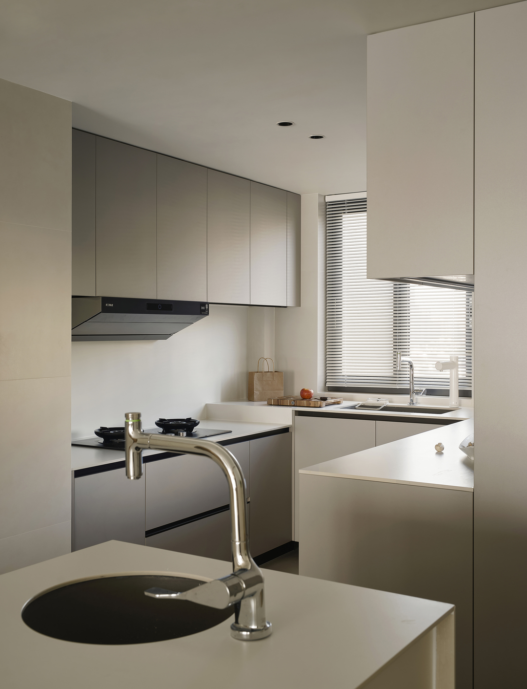 中厨于内,西厨于外,餐厨系统自成一体,严丝合缝地将冰箱、蒸烤箱等设备嵌入,确保了烹饪时的动线流畅,赋予简洁的空间画面。