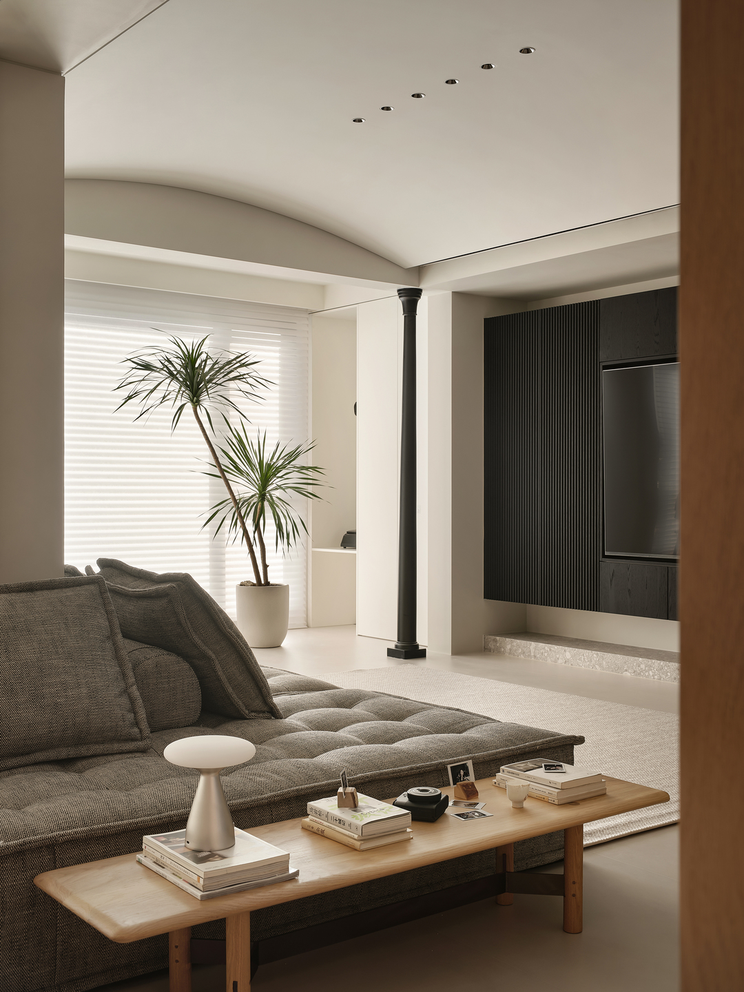 客厅的落地窗和洒入的阳光,创造了一个通透明亮的舒适环境,顶部的拱形造型使空间呈现出轻盈流畅的感觉。电视背景恰当的比例和干净的层次带来和谐的愉悦感,与可变化的沙发形成更具有想象力的生活憧憬。