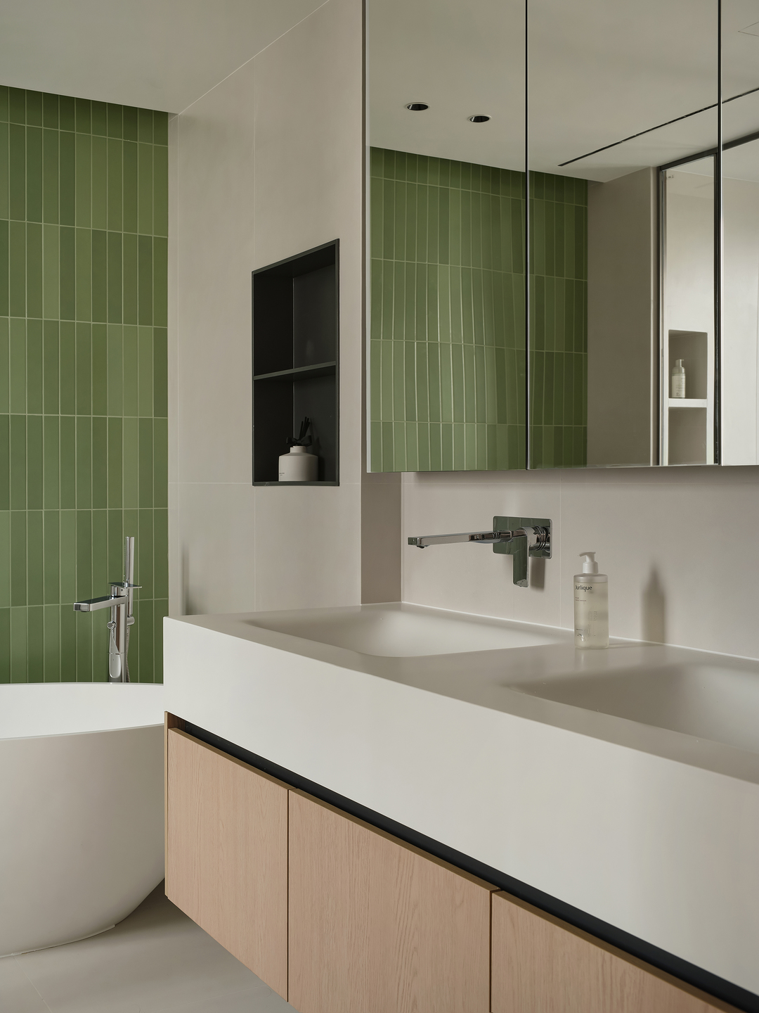 主卫一进来便给人一种清爽的感觉,因为铺面而来的是一面用了不同明度的绿色手工砖,哑光质感,并做了同色系的美缝。