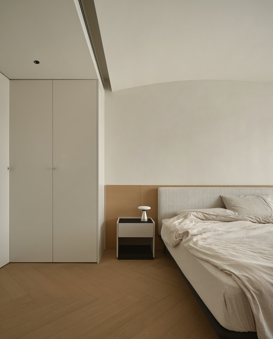 由于次卧的内退,一根承重柱裸露出来了。我们用木饰面将其包裹,做出柔和的椭圆造型,削弱存在感,合理的化解到空间当中,由此打造出两条动线模式。