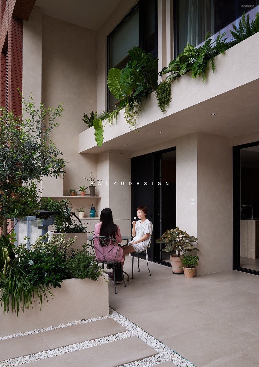 在勾勒好空间的轮廓后,我们从屋主的心理诉求出发开展设计,将入户区改造为一个充满生机的垂直绿化空间。这里的绿植不仅有亲手移植的,还有鸟儿衔来的种子自然生长,一旁的橄榄树也在今年吸引了飞鸟来此筑巢。整个户外休闲区为家庭成员们提供了日常和假期的相聚场所。