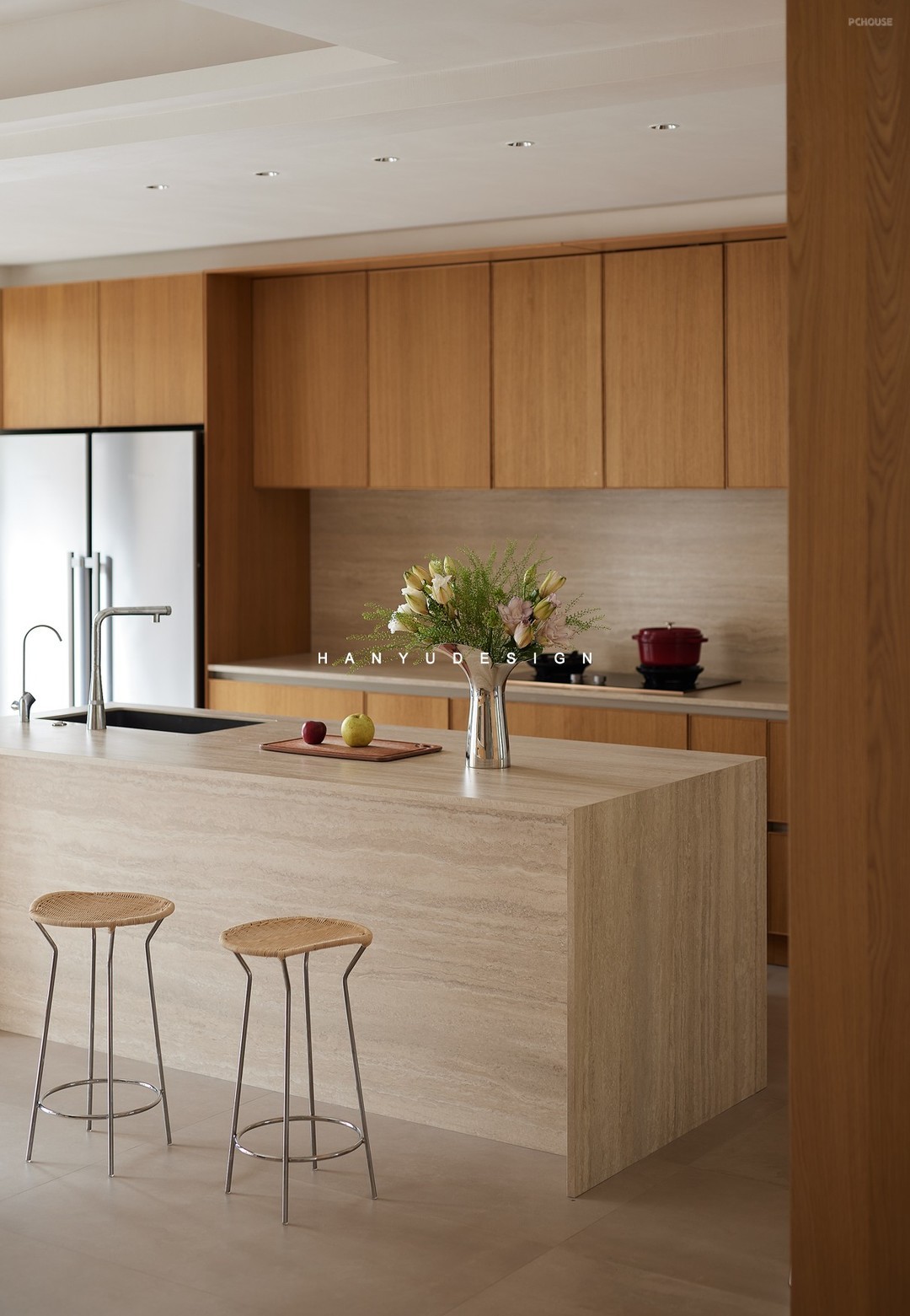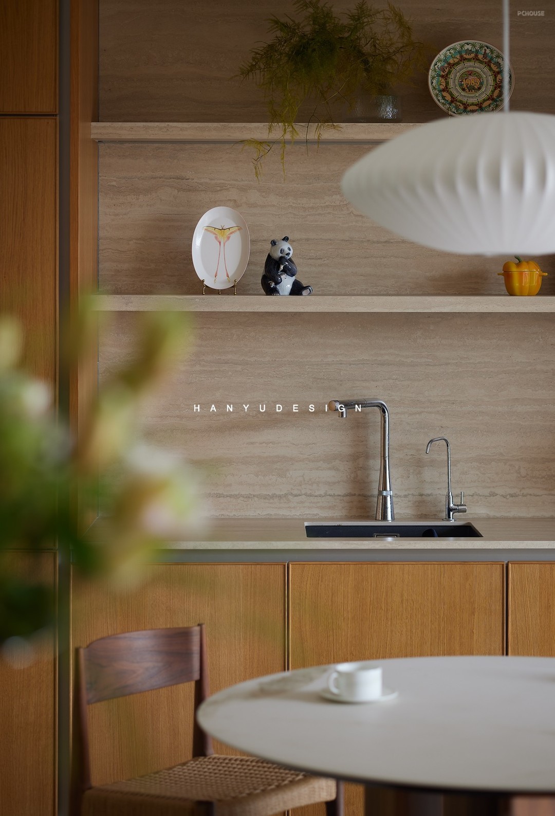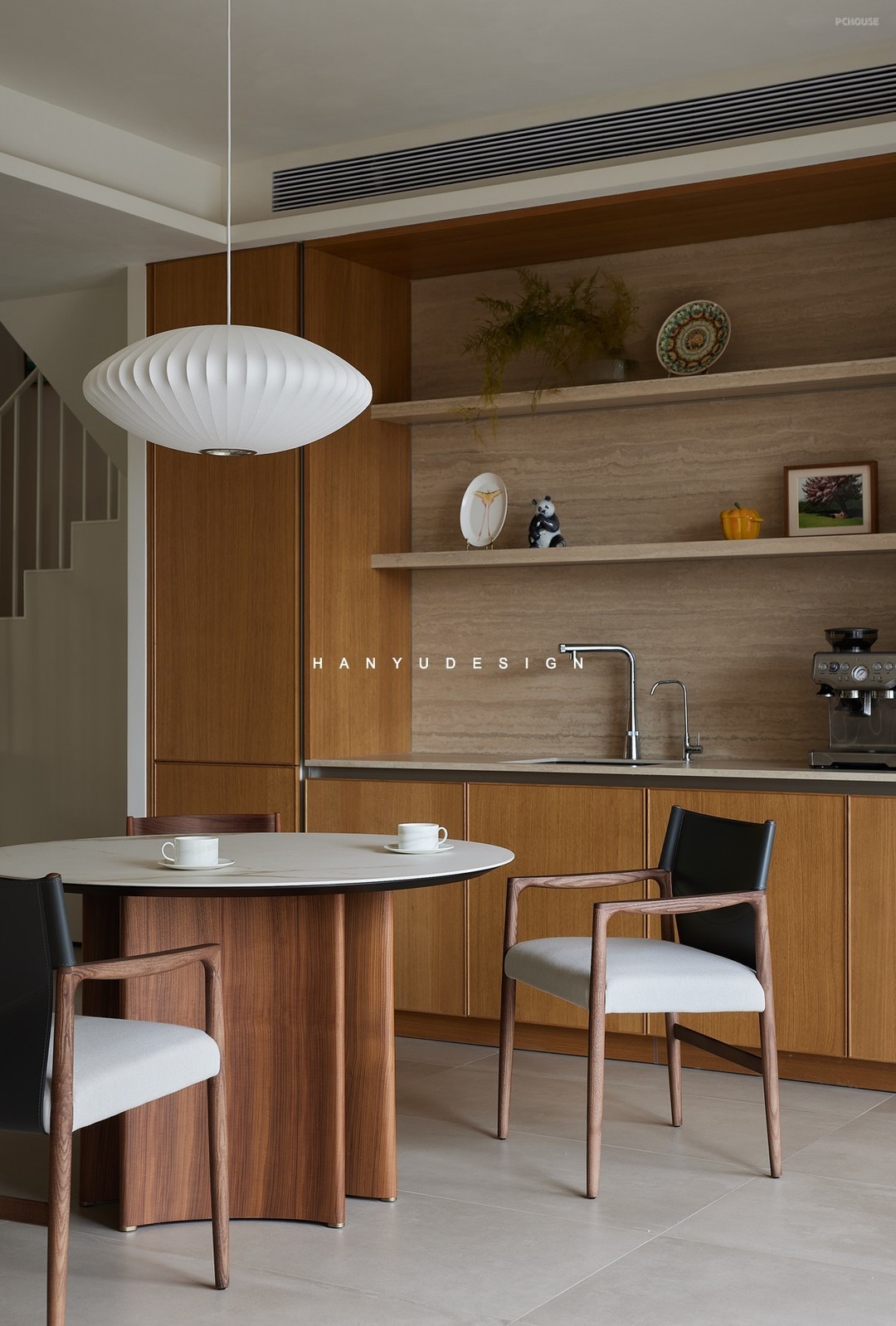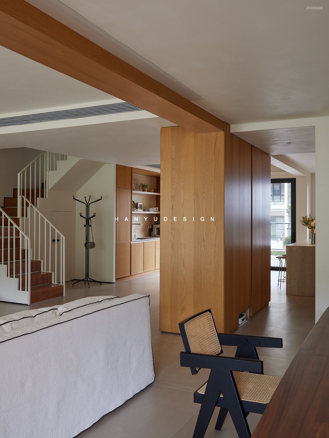 汲取木材的优雅与美感,以捕捉其自然之美,将感性的美学与理性的空间质感完美结合,这样的设计赋予了室内一种平和而宁静的氛围。温暖的质感与表面细腻的纹理在每一寸空间中交织,营造出一种恰到好处的精致与高端感。