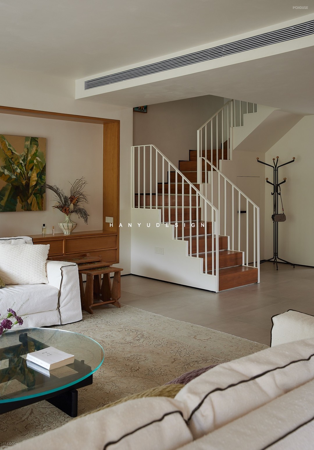 在权衡了“游动式”大开间与保留原始挑高的利弊之后,我们决定将原本一楼的卧室与客厅之间的隔断打通,从而将视野从竖向延伸转变为横向开阔,一层的层高也达到了舒适的2.7m,这一大胆的开放设计不仅补偿了空间高度上的压缩感,而且确保了从每个区域都能轻松感受到室外的绿意,让自然景观成为居住空间的延伸。