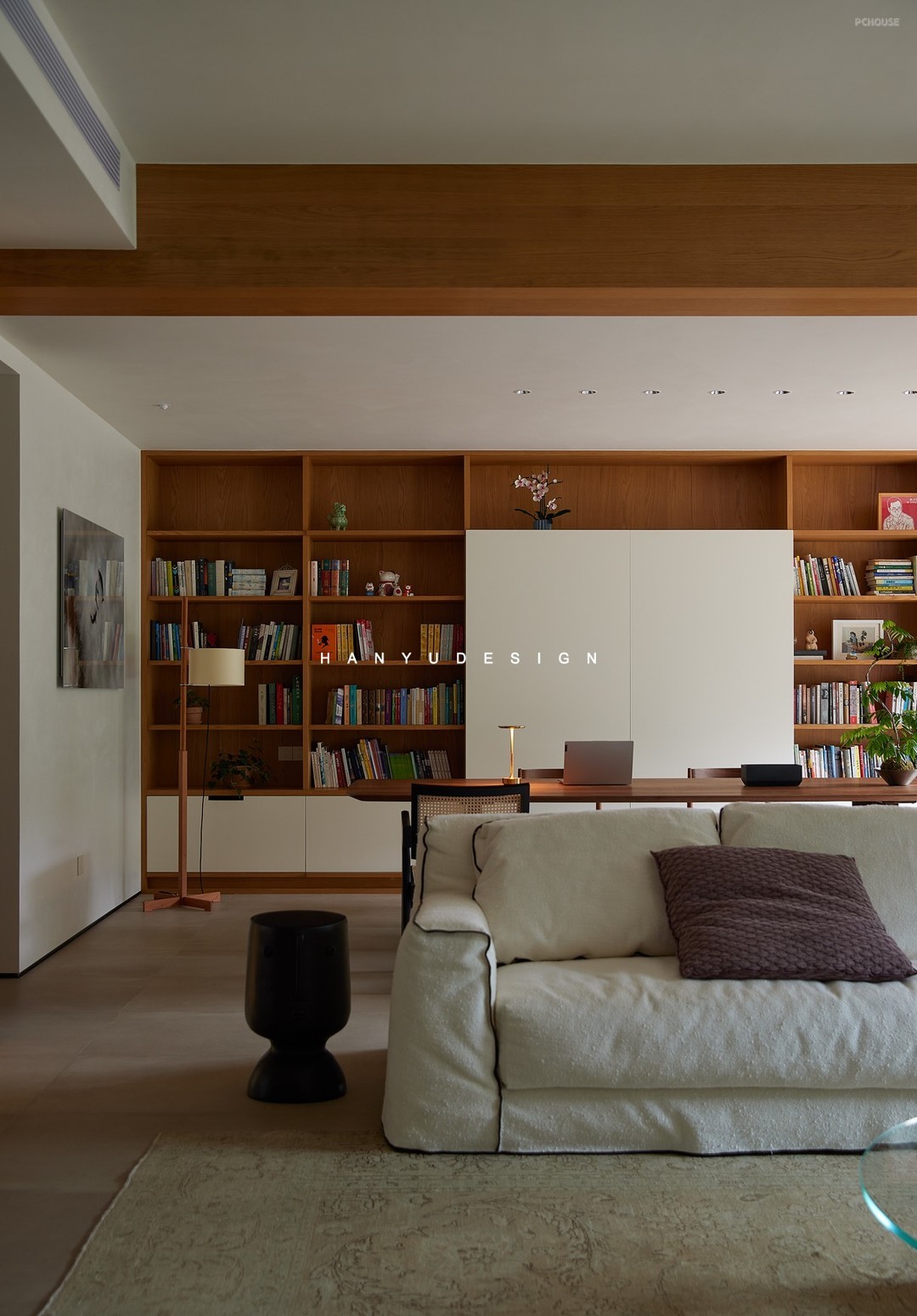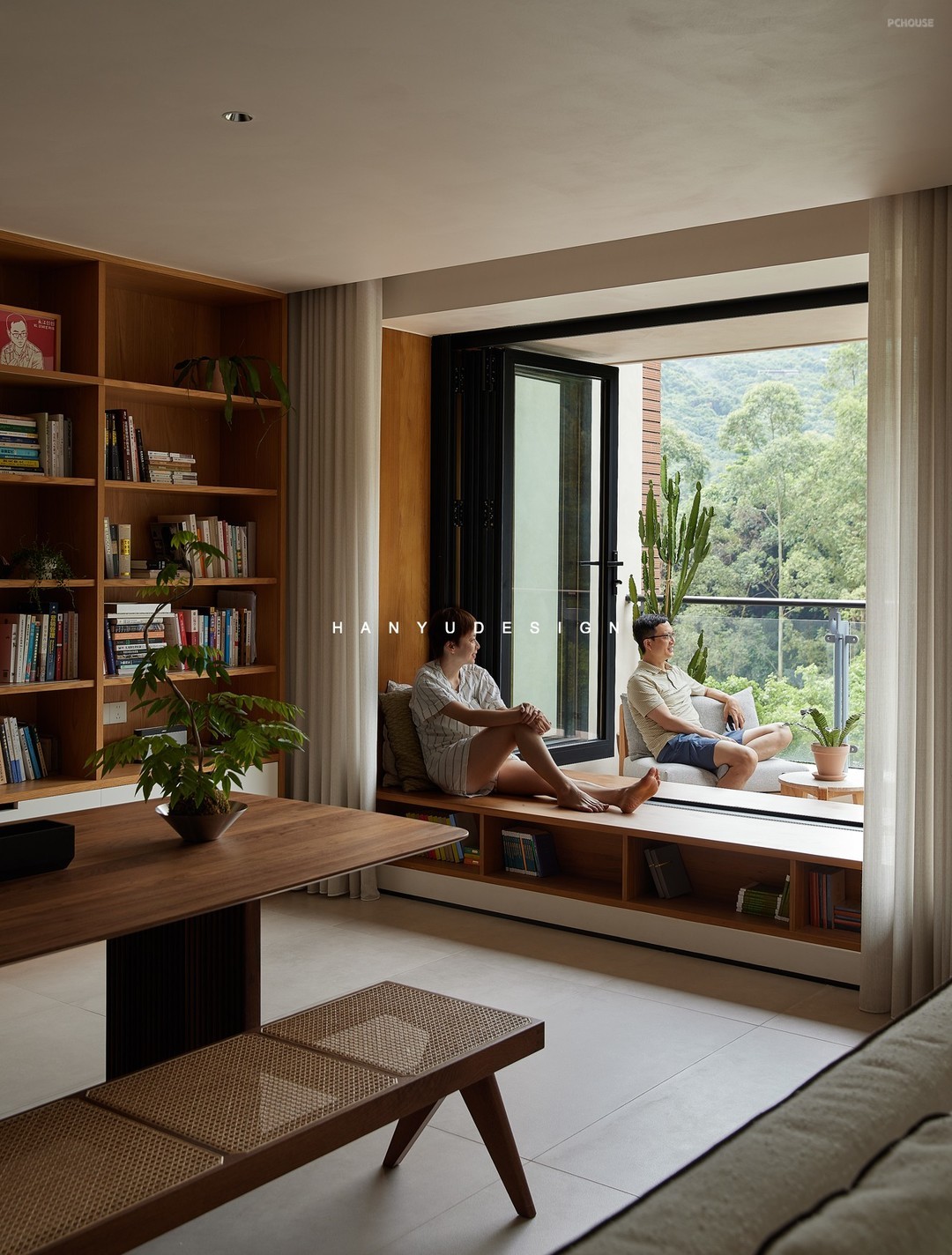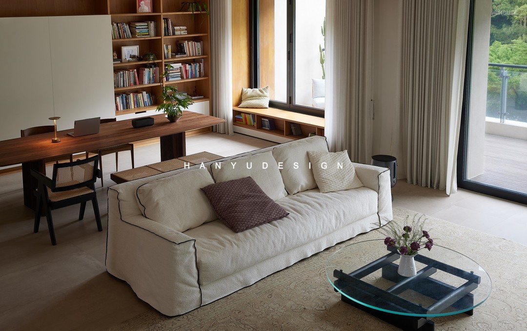 除了采用开放式结构以营造流动的空间感,我们还巧妙地在空间疏密之间找到了平衡。客厅通向阳台采用了双动线,特别值得一提的是,书房一侧的“门”被别致的可折叠窗户所取代,这样创新的设计将阳台转变为一个互动性围合区域,极大地延长了家庭成员在此区域的停留时间。