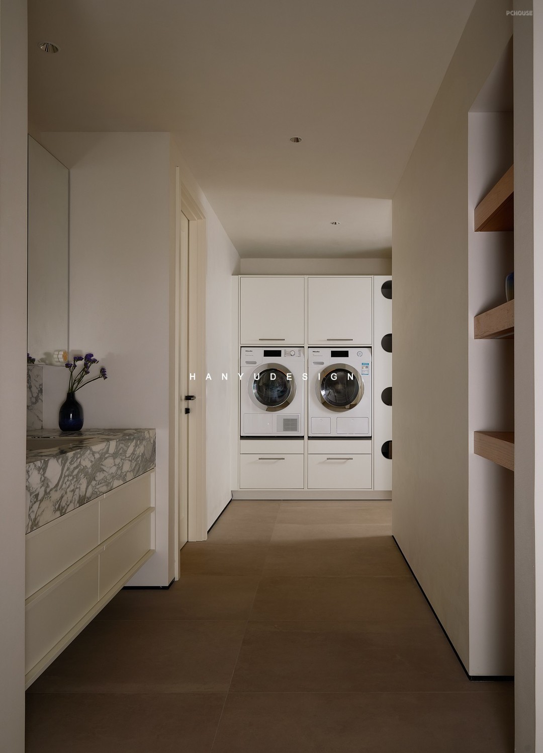 家政洗烘套装全部定制上墙,干净块面的空间底蕴,巧妙地减轻了家用电器的体积感。在这里,洗衣、烘干、收纳等一系列动作得以一气呵成,既实用又美观。