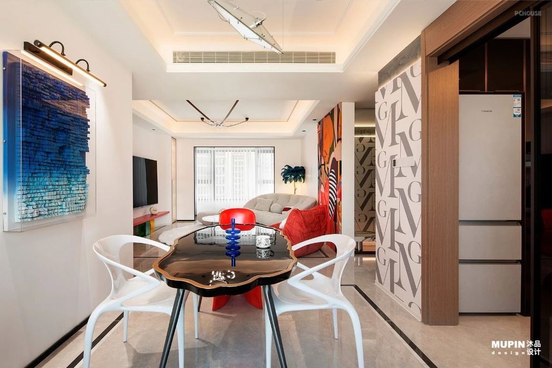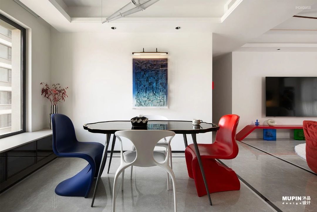 搭配红蓝两色餐椅围绕异形餐桌摆放,