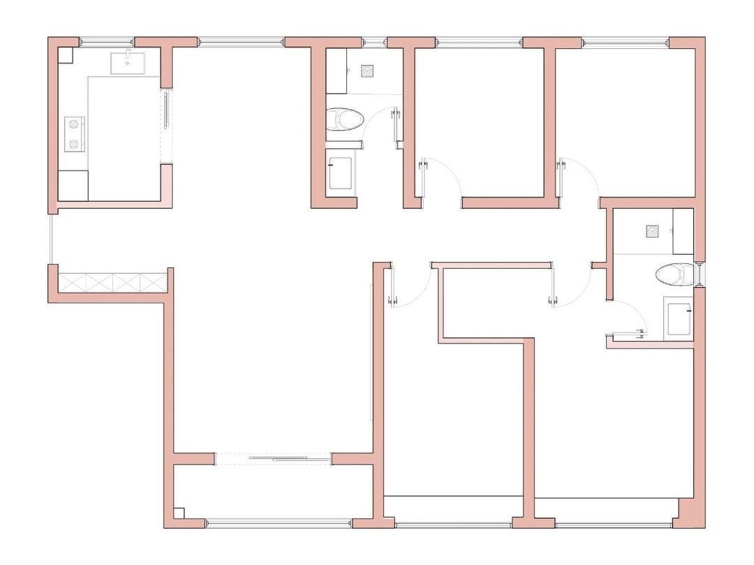 ①将原本相邻的次卧与衣帽间非承重墙体拆除,合并为一个整体空间,重新规划为 “超大步入式衣帽间 + 灵活功能区” 的组合。