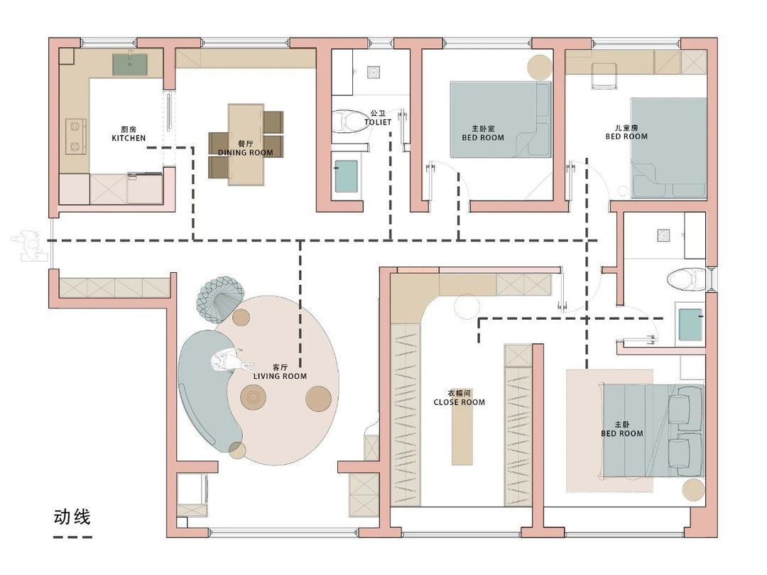 ②全屋采用 “动静分区” 原则,公共活动区域(客厅、餐厅、厨房)集中于入户一侧,形成开放互动的核心空间;主卧、儿童房与新改造的三室空间位于内侧,确保安静私密的休息环境。