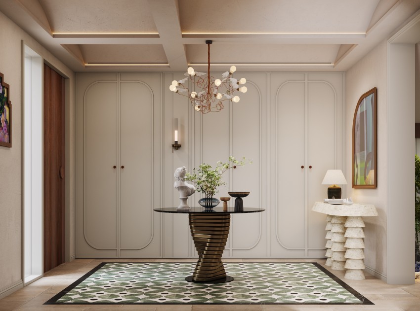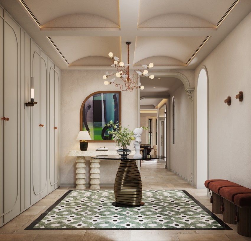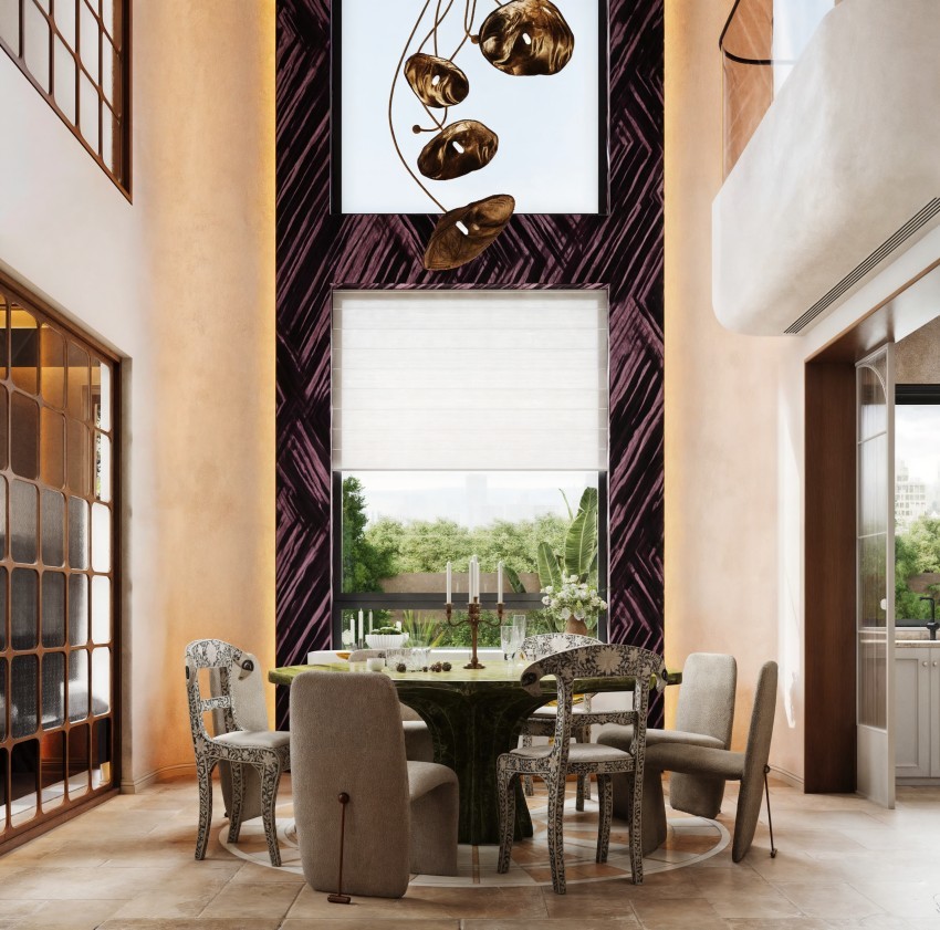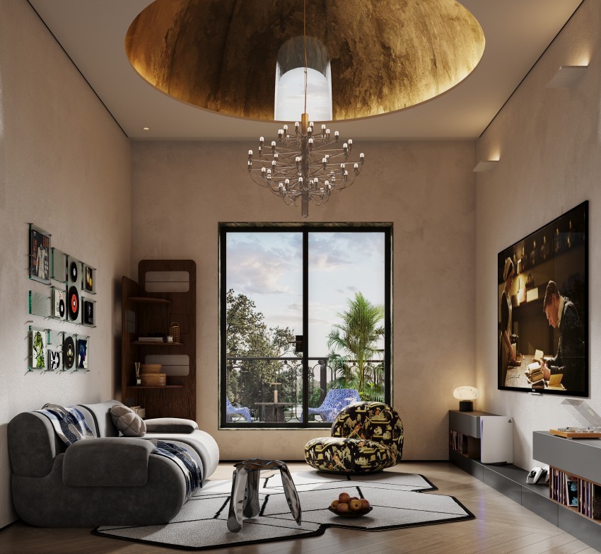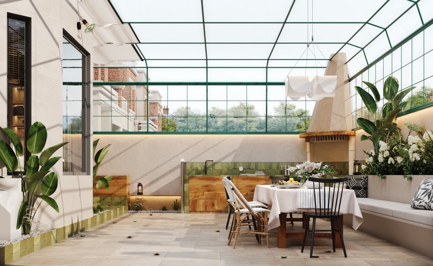 - 可开合玻璃穹顶下,温室客厅随季变换为茶室/星空影院