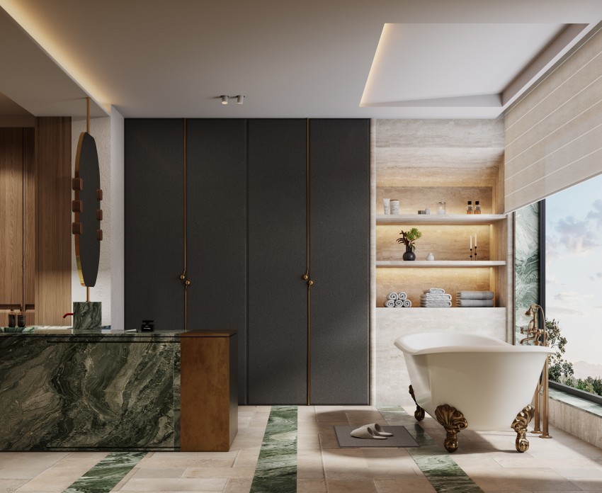 - 浴室 **悬空玻璃浴缸 凌驾于古树冠顶,沐浴时如栖居鹰巢