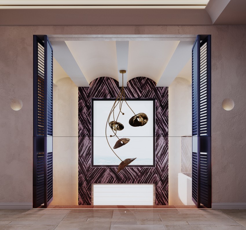 - 天然石材肌理墙面与倒影水池,模糊建筑边界