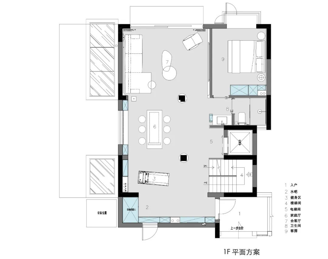 1F:客厅、家庭室、健身区、父母房、卫生间