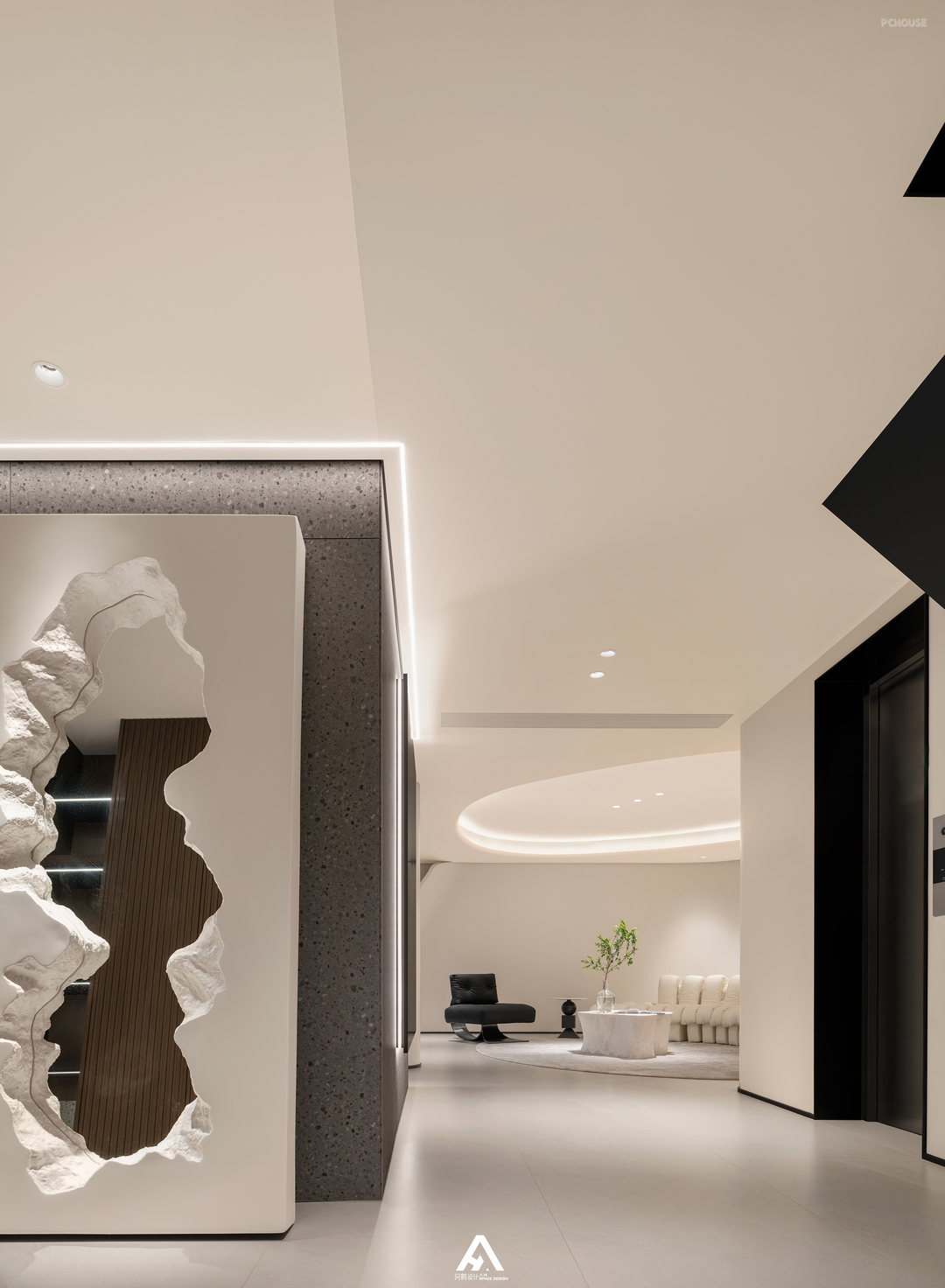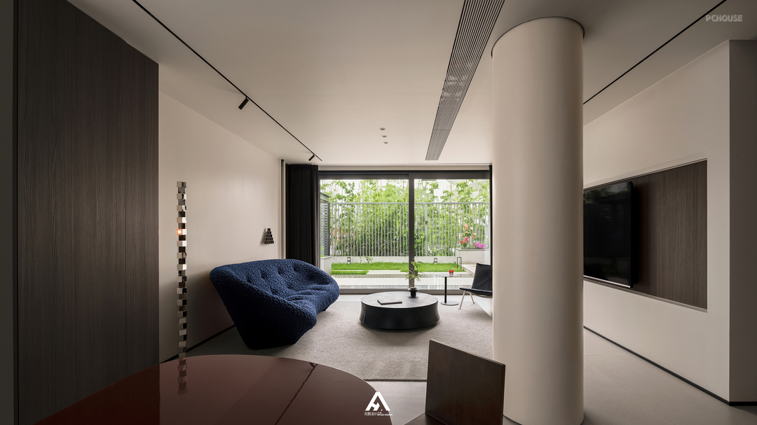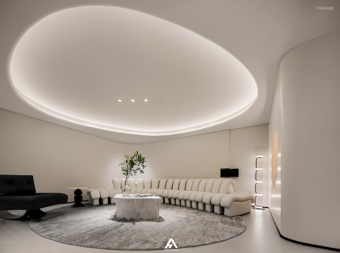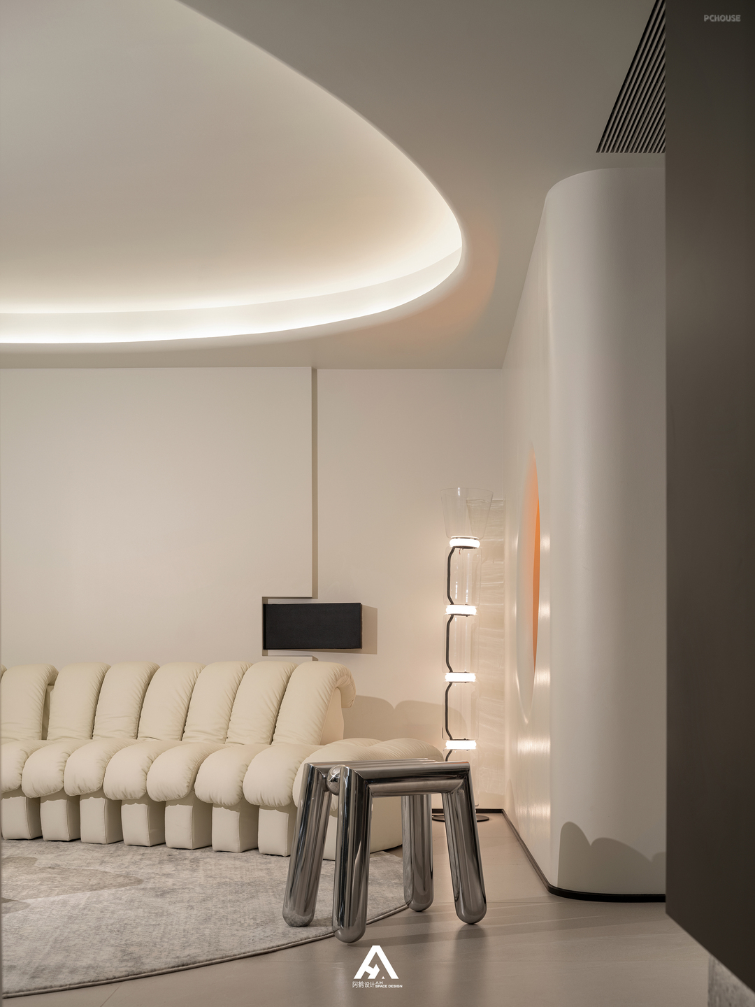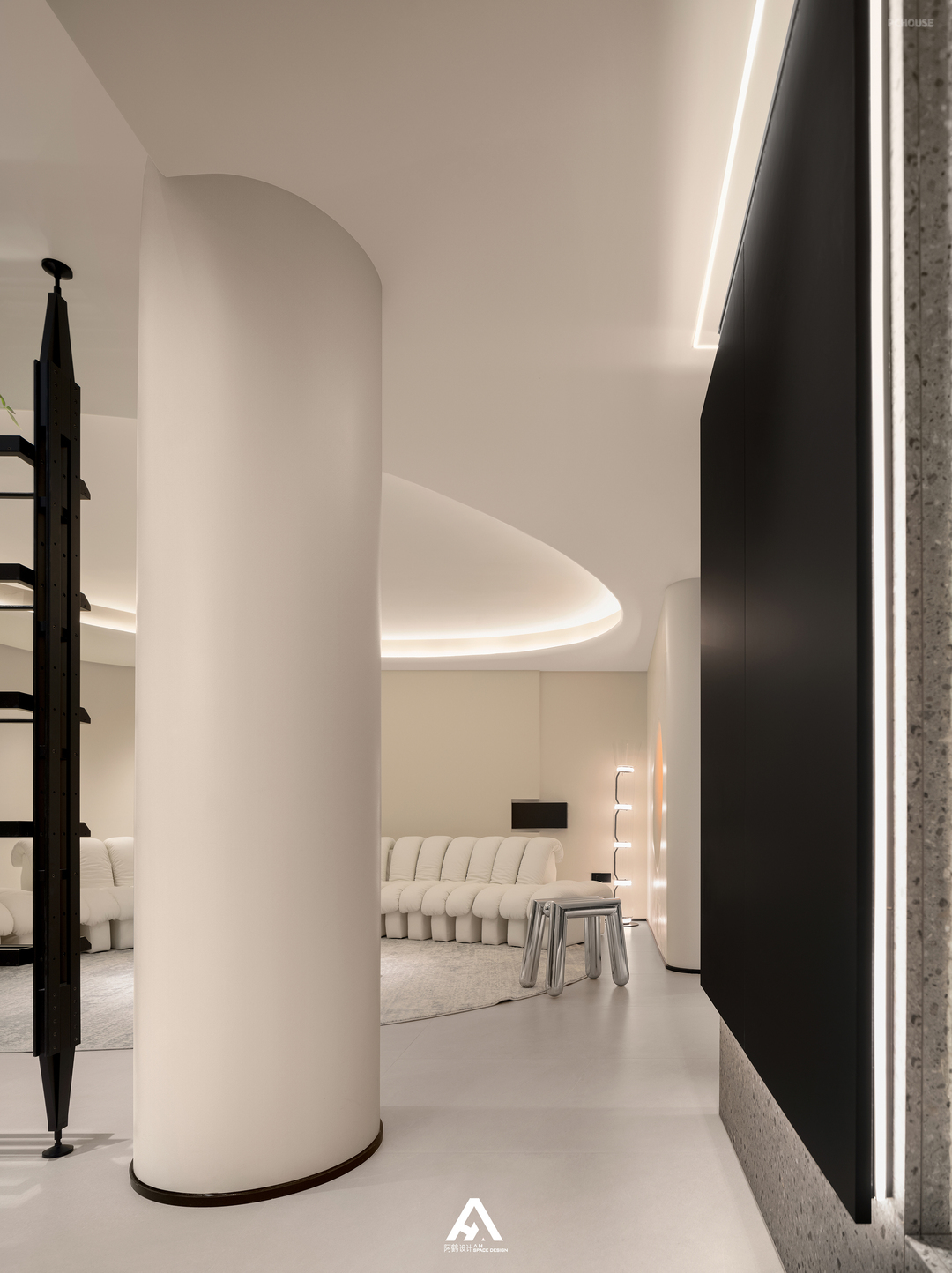 空间采用开放式动线,虽有视觉分隔,整体扔保持连贯流动。家具精简,每件家具都精心挑选,成为传递空间情绪的载体。多材质交融赋予空间趣味,几何形体与弧形柱构建层次,让简约空间有视觉张力。