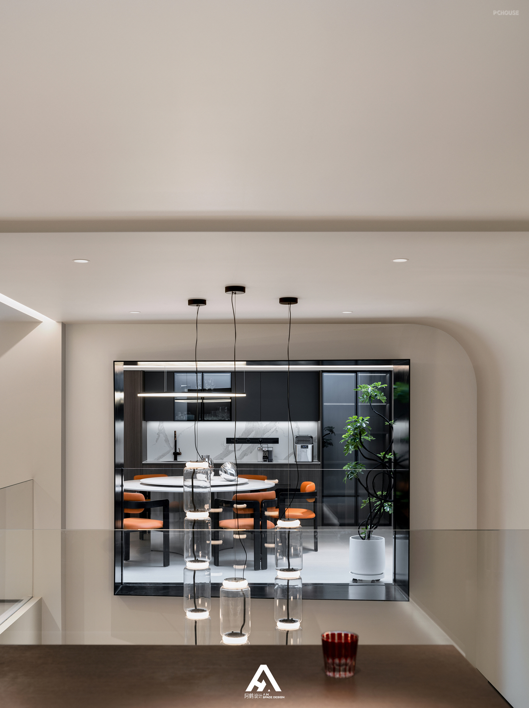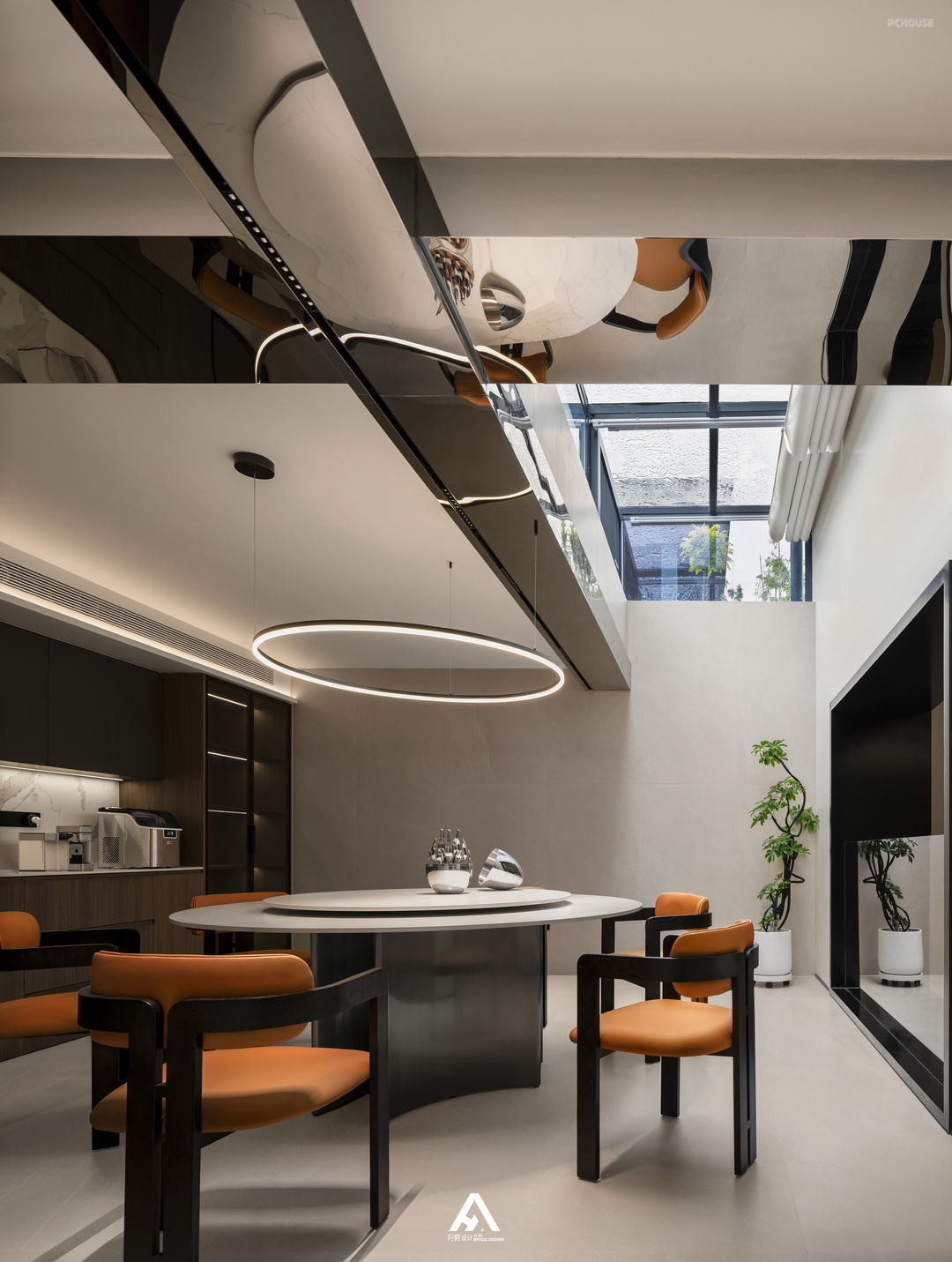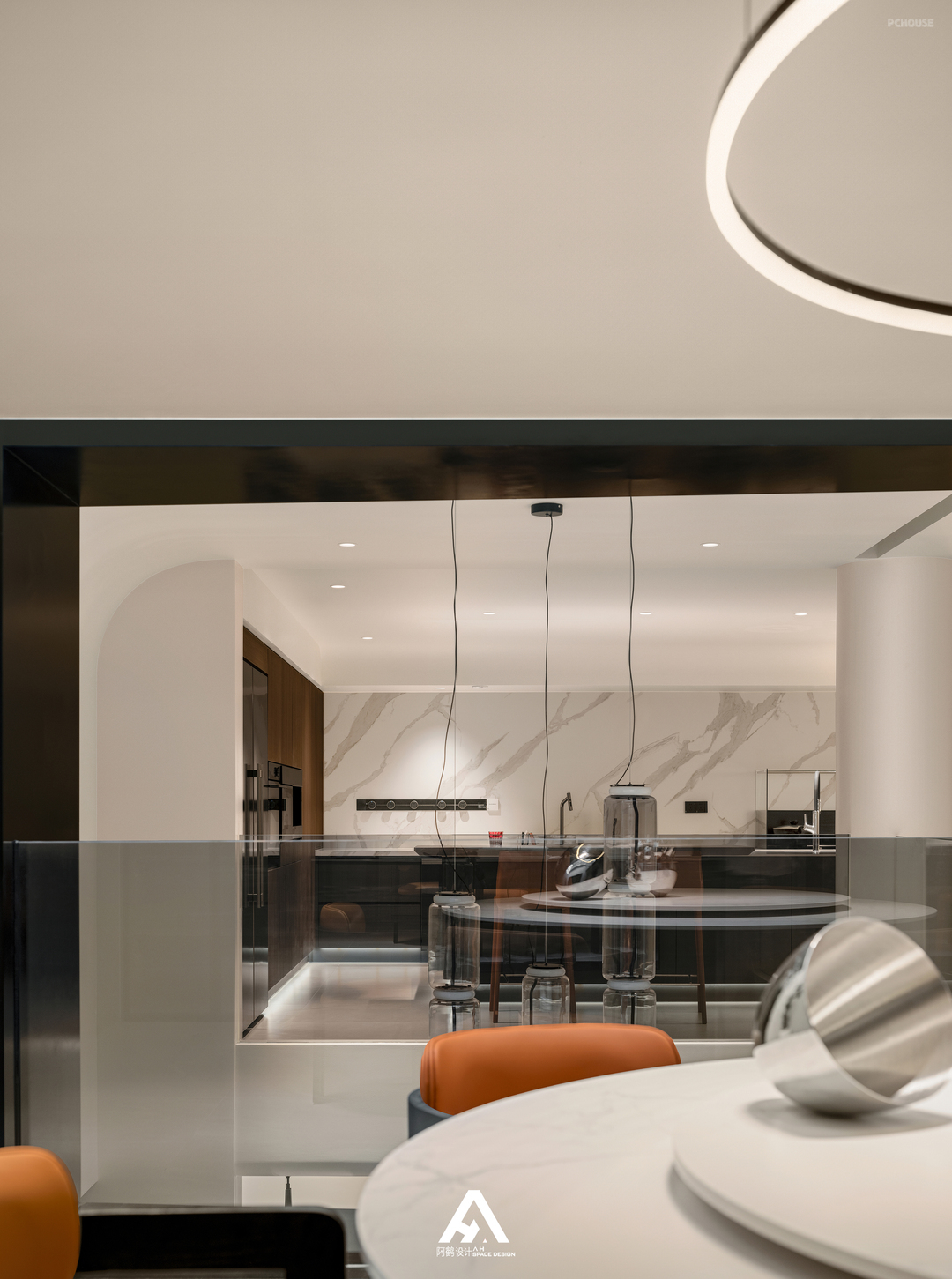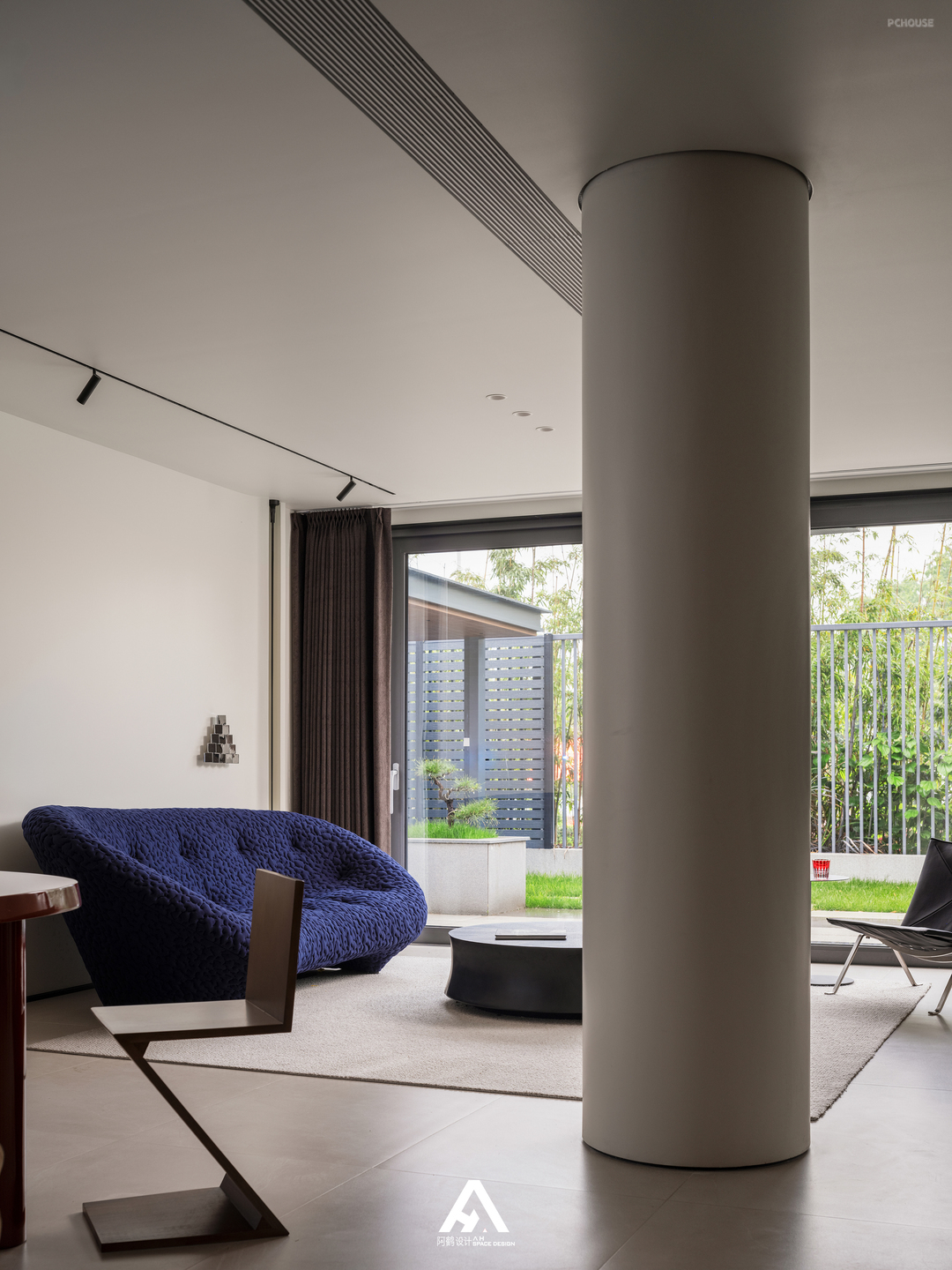 空间采用开放式动线,虽有视觉分隔,整体扔保持连贯流动。家具精简,每件家具都精心挑选,成为传递空间情绪的载体。多材质交融赋予空间趣味,几何形体与弧形柱构建层次,让简约空间有视觉张力。