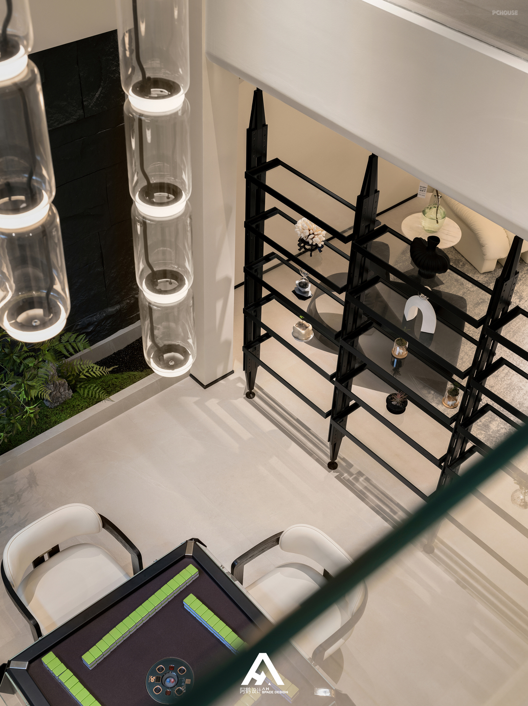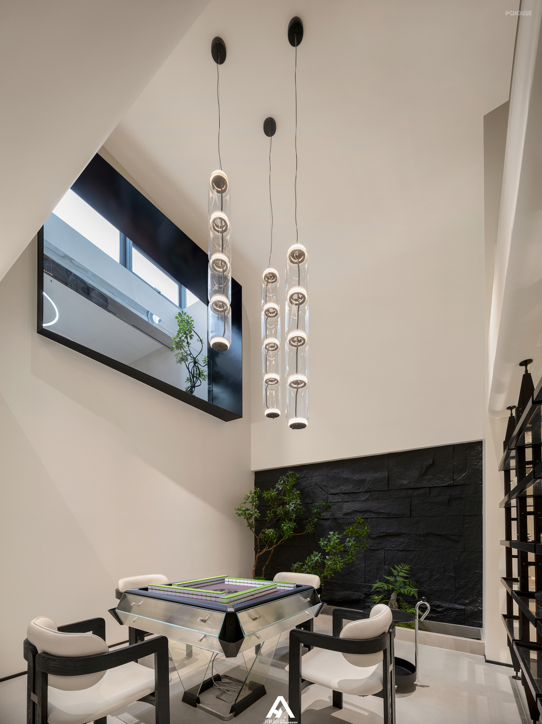 棋牌空间紧邻休闲客厅,通过客厅展示柜,形成“隔而不断”的视觉连贯性。与客厅功能上相互独立,形式上又和谐统一,整个空间闲适之中充满着豁达人生之趣。天窗引入自然光,提升空间通透感与层次感。这些细节设计,让居住者不断收获新的惊喜。