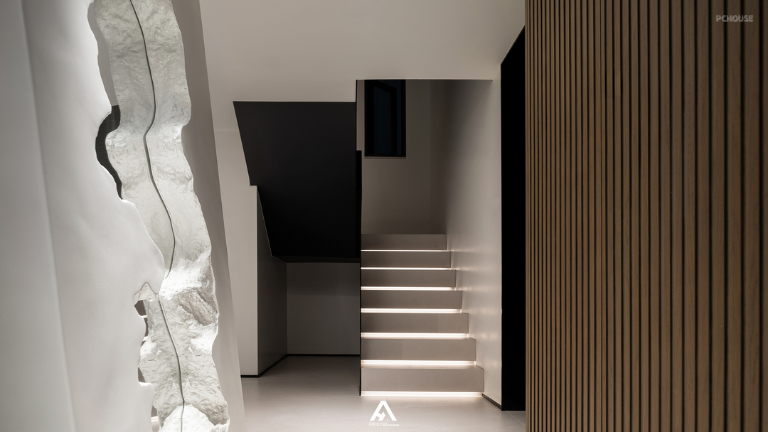 沉稳黑色螺旋楼梯宛如艺术杰作,楼梯踏步下方安装了灯带,这简直是整个楼梯的点睛之笔,暖黄色灯光亮起,柔和又温馨,不仅提升了空间的氛围感,还起到了夜间照明的作用,安全又浪漫。