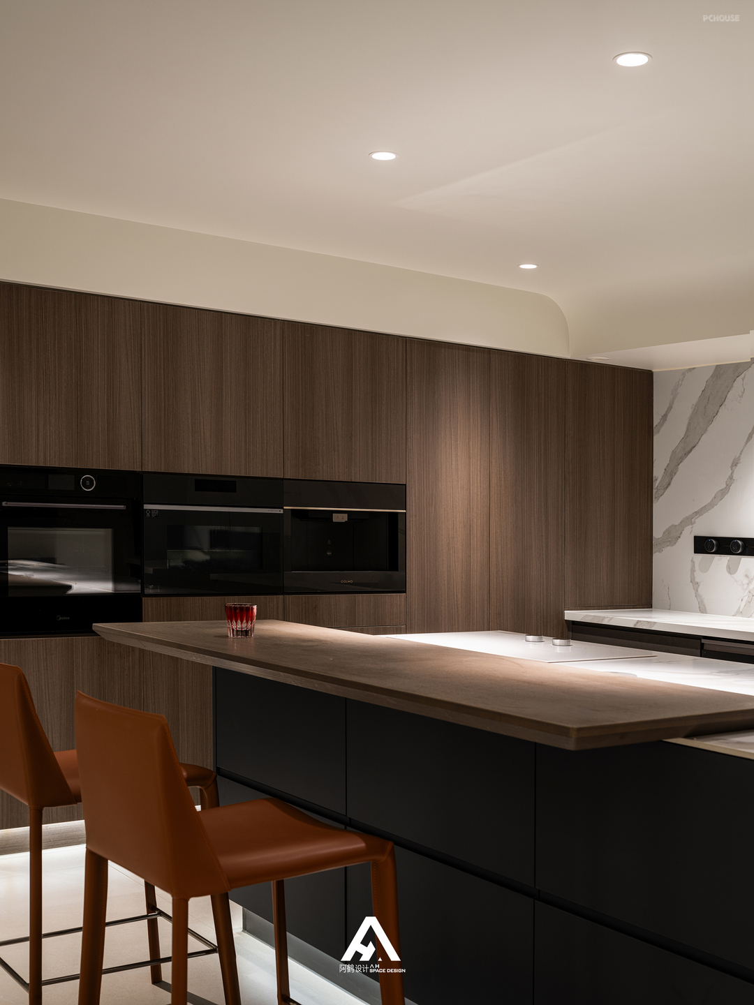 中岛台与主餐区形成功能互补,高脚椅成为晨间咖啡、深夜小酌的闲适据点,烟火气与设计感在此共生。灶台氤氲的热气里,藏着家的密码,是时间写给味蕾的情书,是对饕餮盛宴的温柔谢幕。