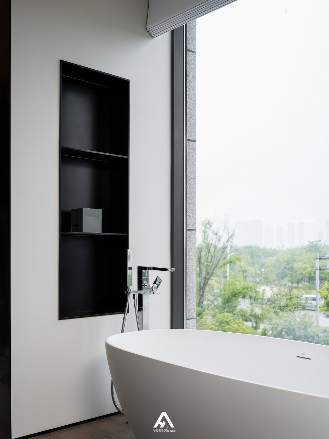 主卧室采用开放式布局,让卧室、衣帽间和卫生间形成一个流畅动线。这样的设计不仅增加了空间的通透感,还让男女主人不同区域之间的互动更加方便,当有需要独立完成办公、化妆等行为思考时,可以形成对话,增强互动且互不干扰。