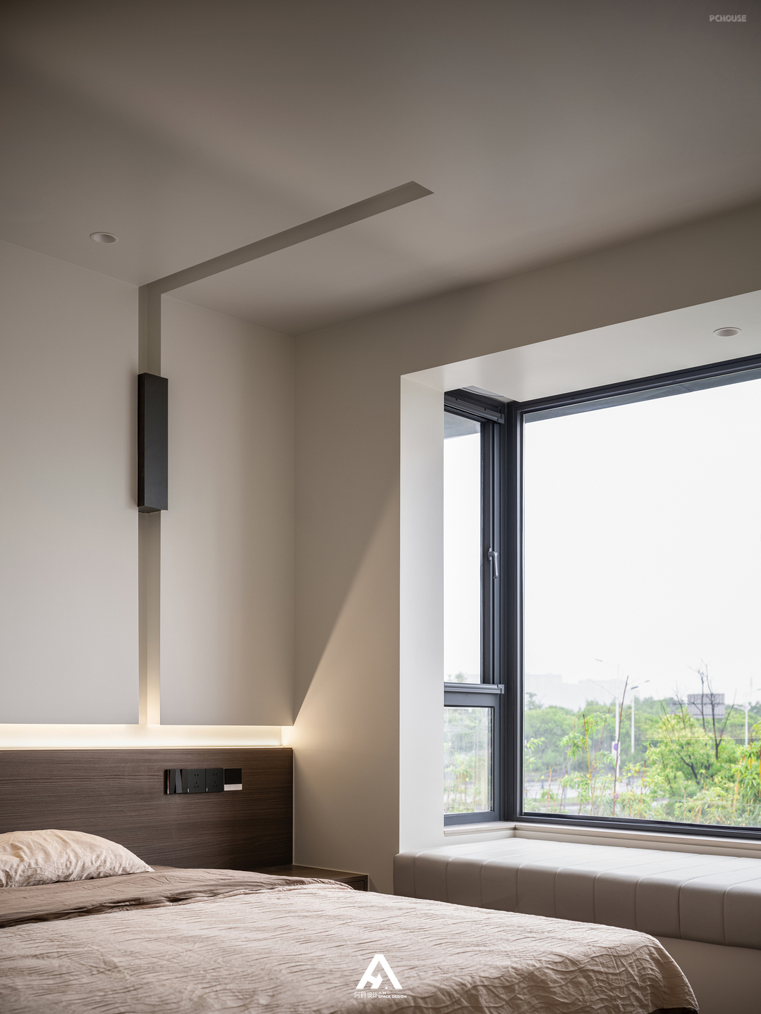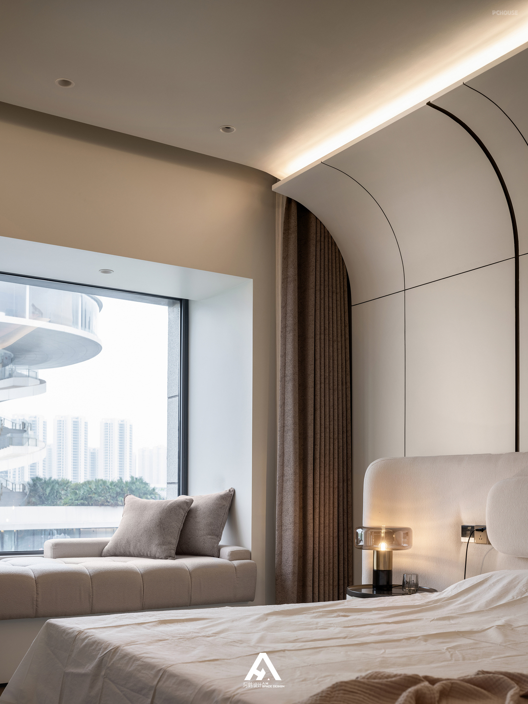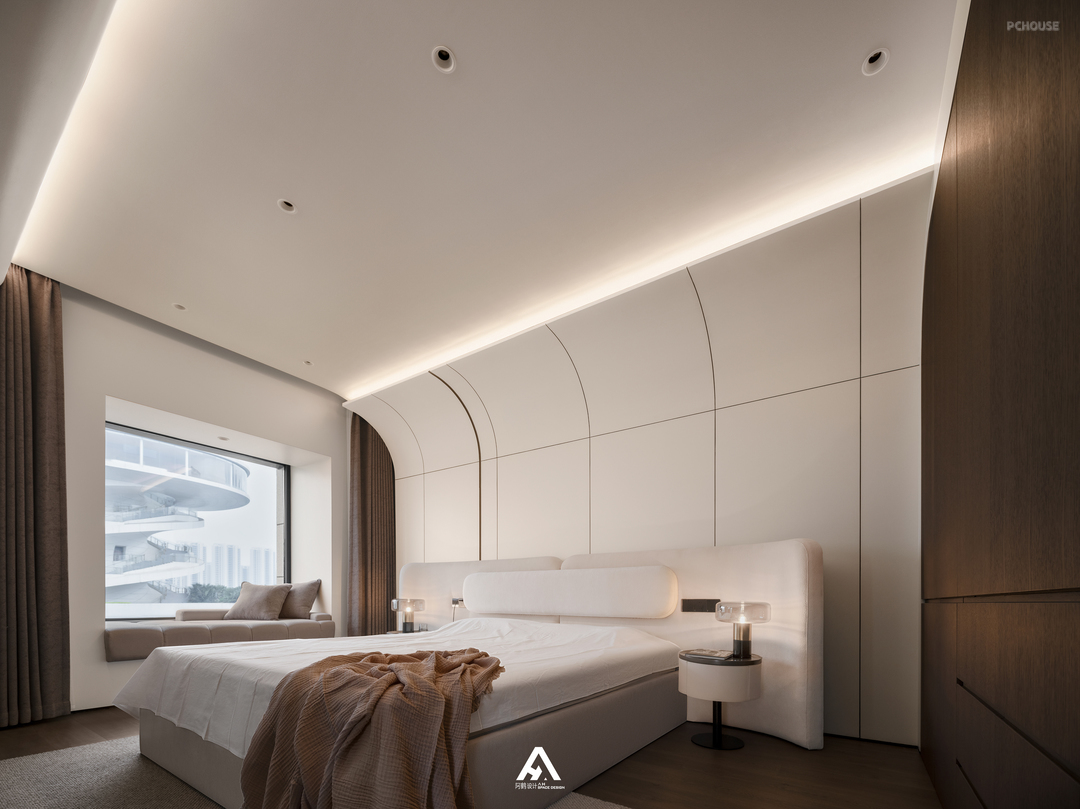 形成了层次感。定制护墙板和床头柜体自然相连,减少了视觉冗余,释放了更多活动空间。灯光设计上,我们采用了多层次的照明方案,主灯提供整体照明,而灯带负责氛围。