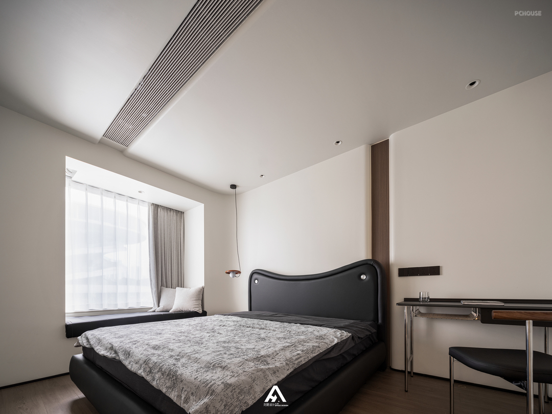 卧室整体色调以米白为主,搭配了一些深色的家具和饰品,填补自然而然的生活。窗帘褶皱里藏着生活的小惊喜,拉开是朝阳,闭合是月光。整体设计兼顾孩子的日常学习等生活习惯,打造出一个松弛有度的休憩场域。