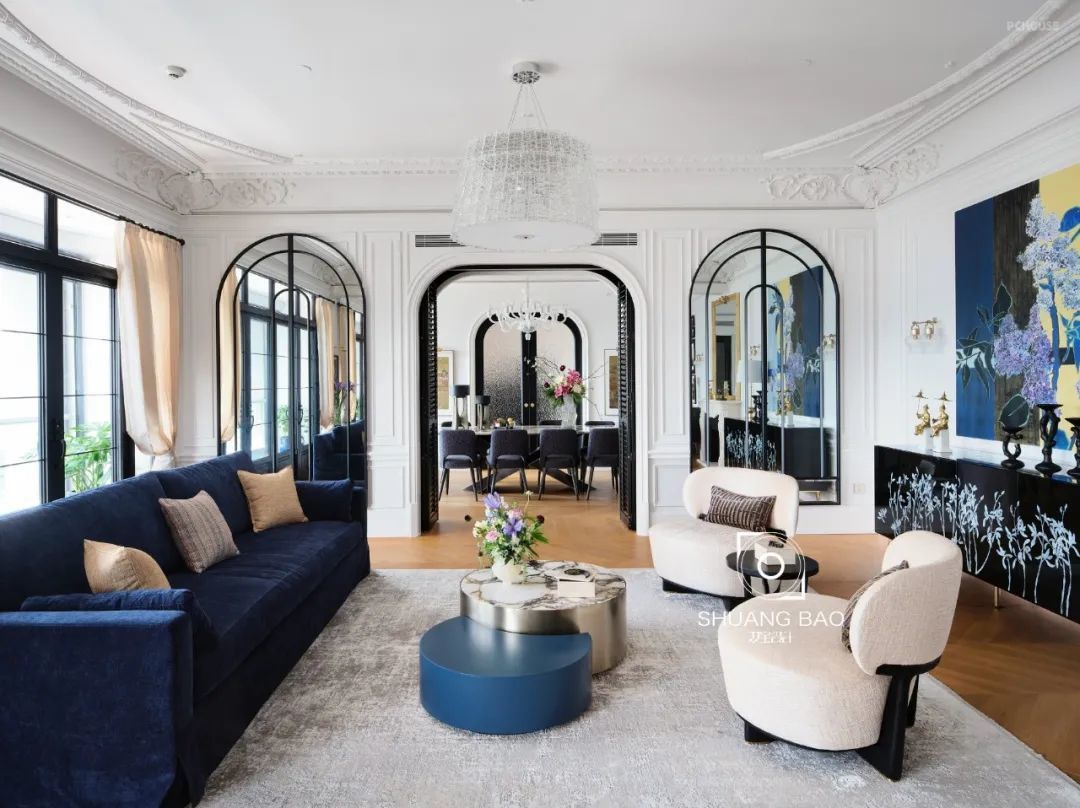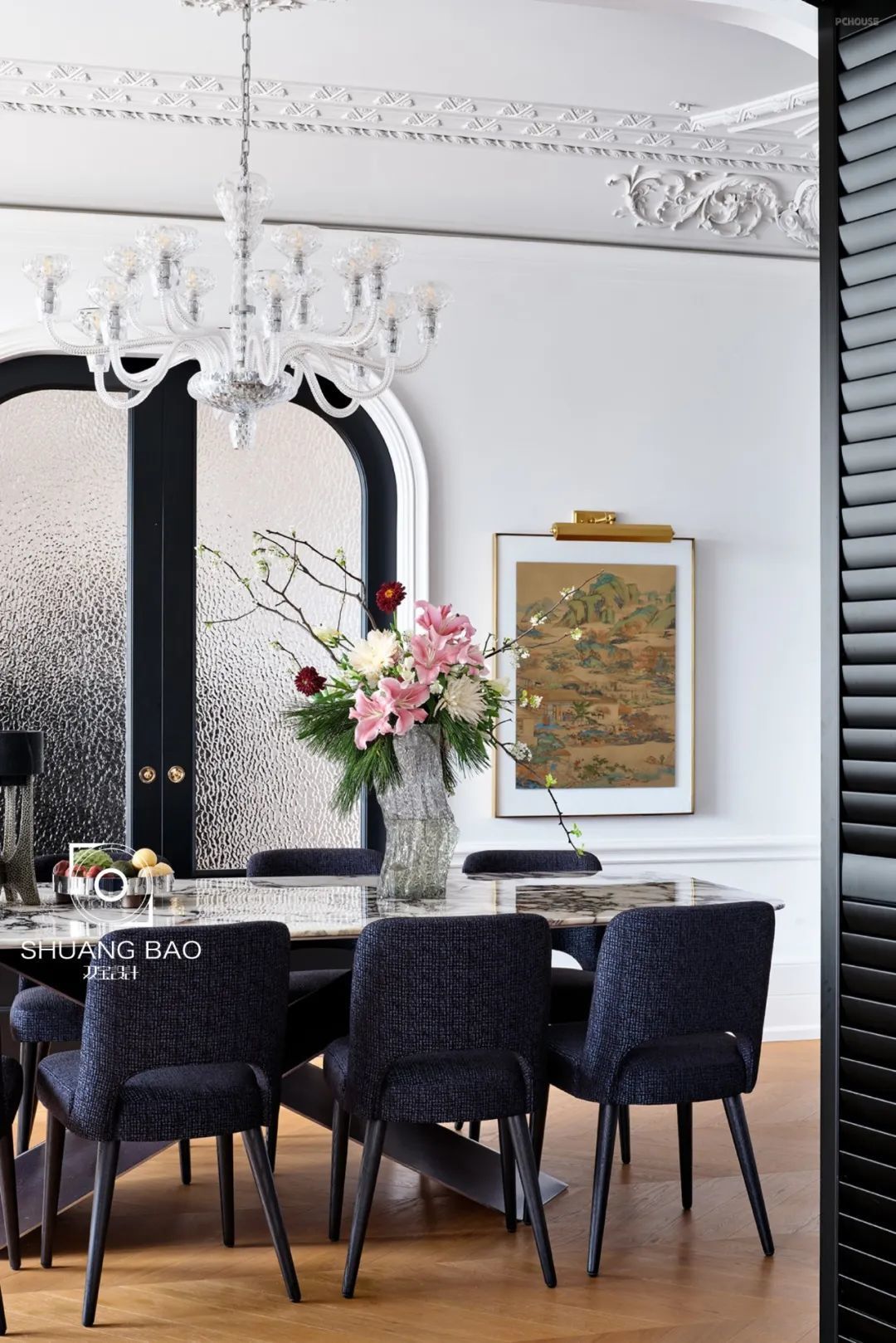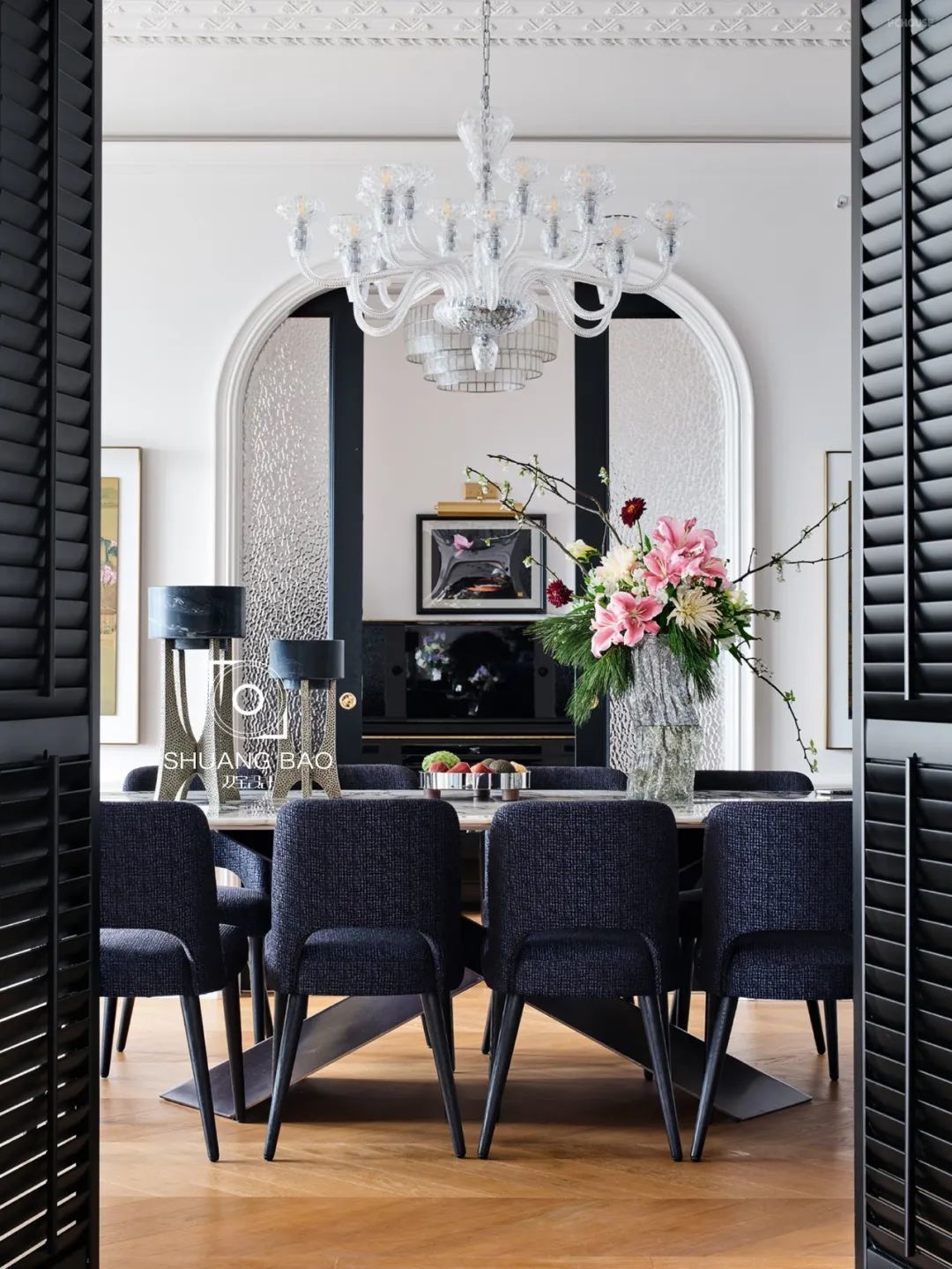 客厅与餐厅间,双开门弧形门洞流淌着浓郁法式韵味,且门洞内设调节百叶系统,可自由切换空间的通透与私密。百叶开启时,空间动线自然舒展,客餐厅合为一体,契合家庭聚会等开放场景需求。视线所及无阻隔,让彼此互动更显亲密;百叶闭合时,客餐厅成为独立功能区,还能实现空调节能化,动静分区互不干扰。无界与有形,彼此默契共生。