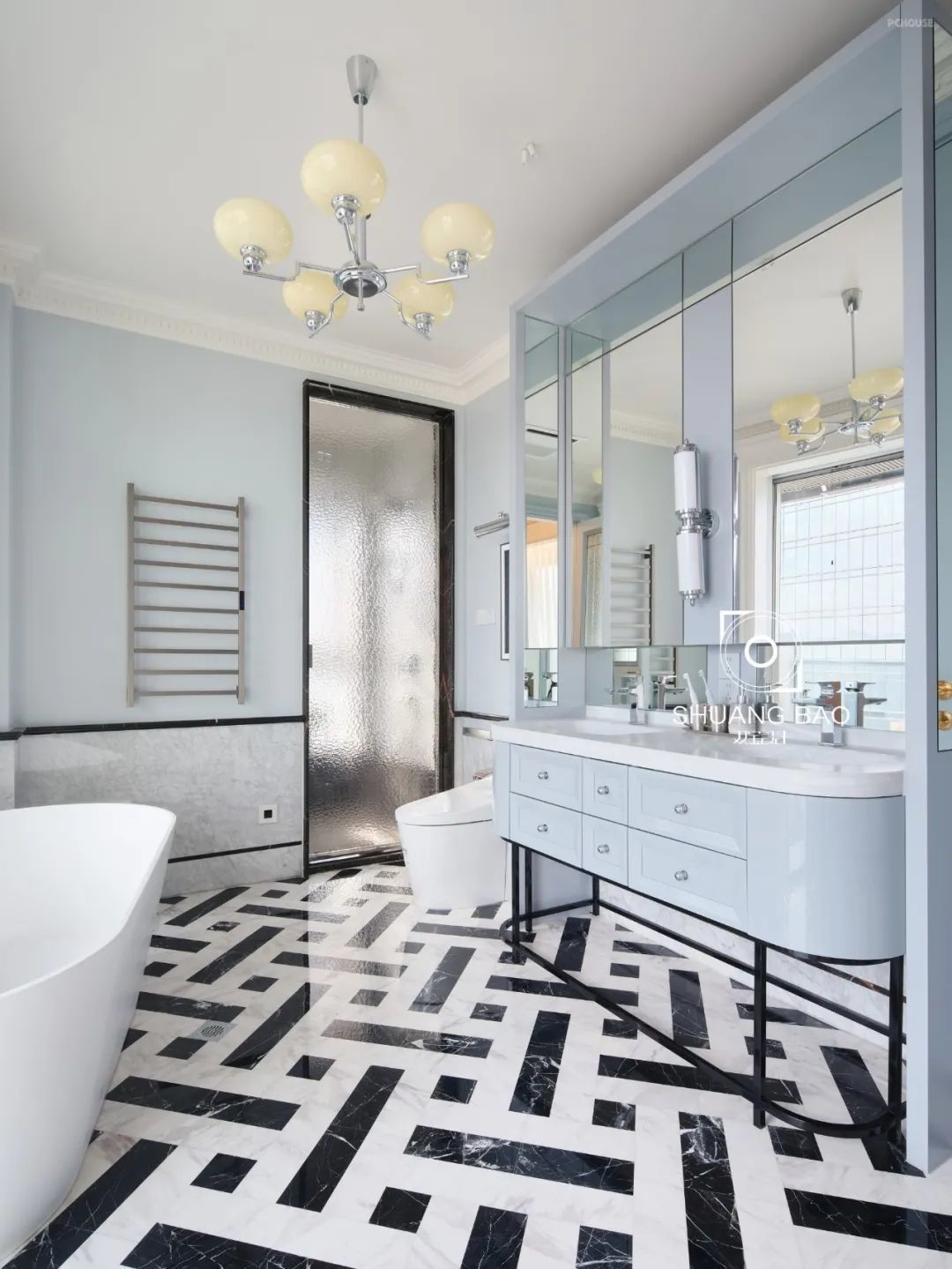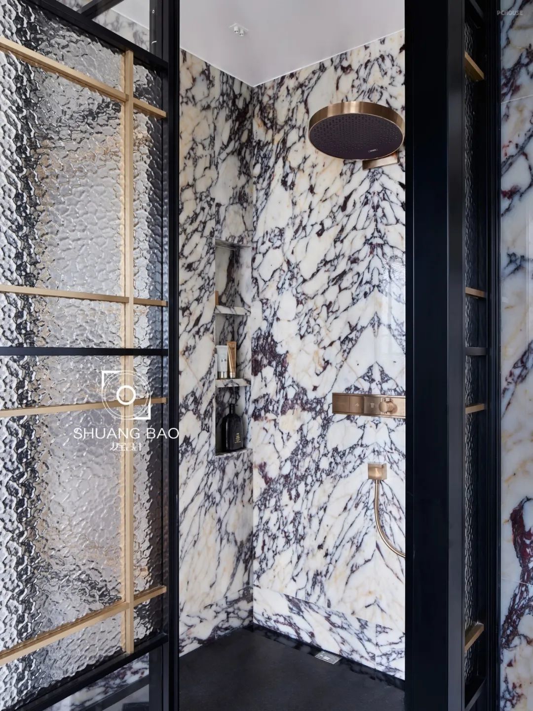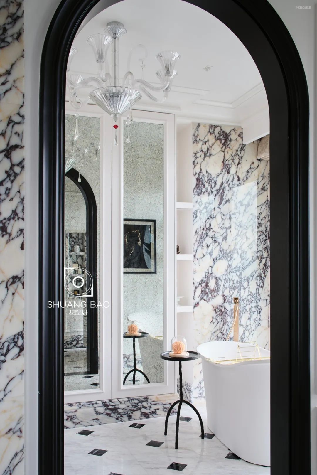 水晶吊灯、迷你壁炉、香薰灯,让私密的卫浴空间倍显极致仪式感,超越了基础实用功能,以松弛与精致兼具的姿态,诠释与自我独处的庄重感。这份自洽不仅源于物质层面的满足,更来自精神层面的愉悦。在此,褪去外界赋予的多重角色,只与自我温柔相拥,卸下一身疲惫,重新唤醒对生活的热爱,沉浸于可贵的片刻静谧。