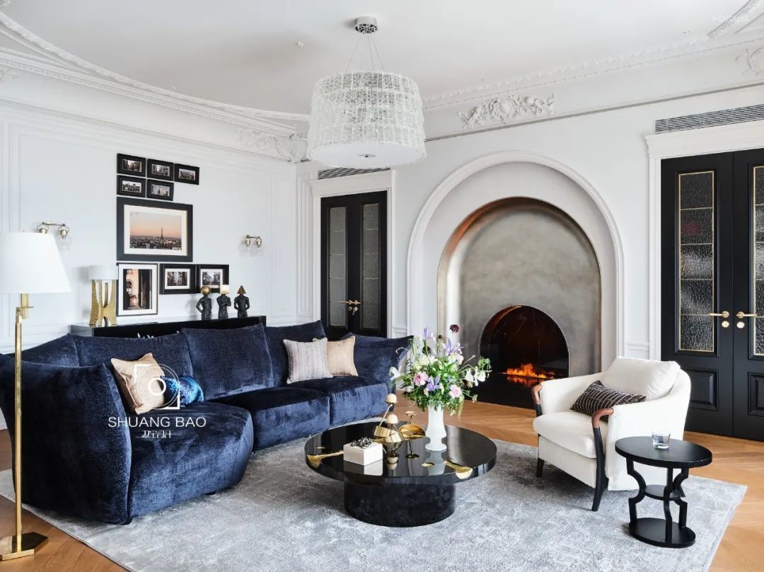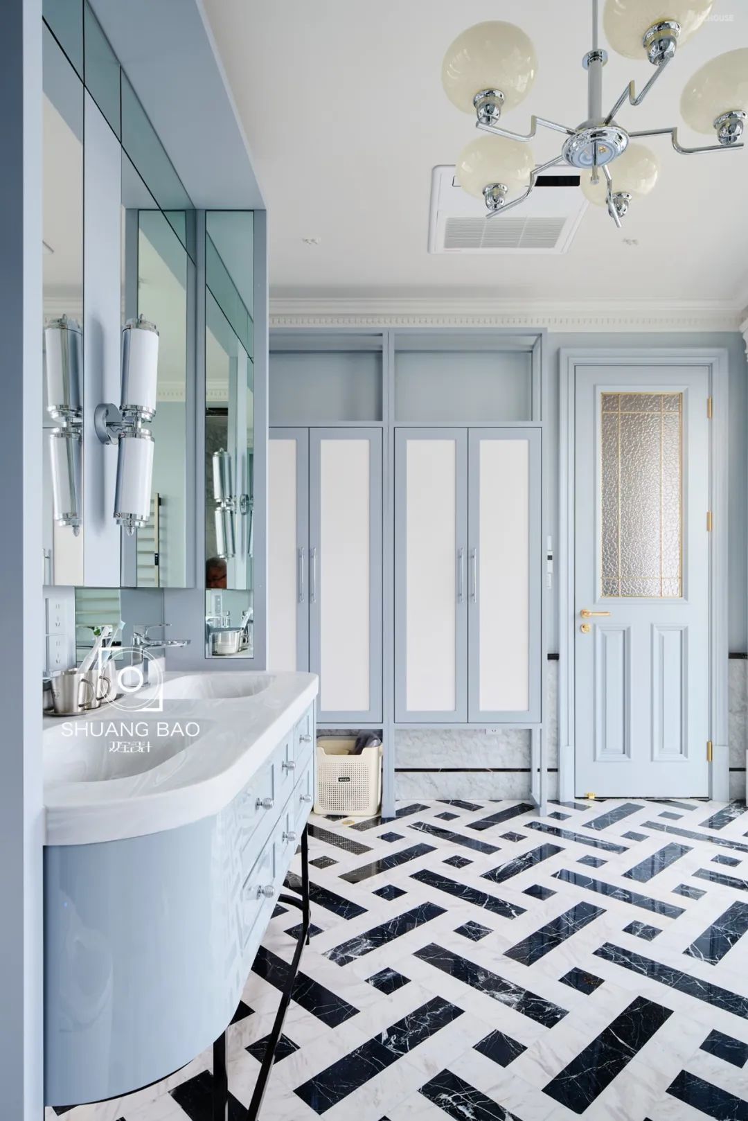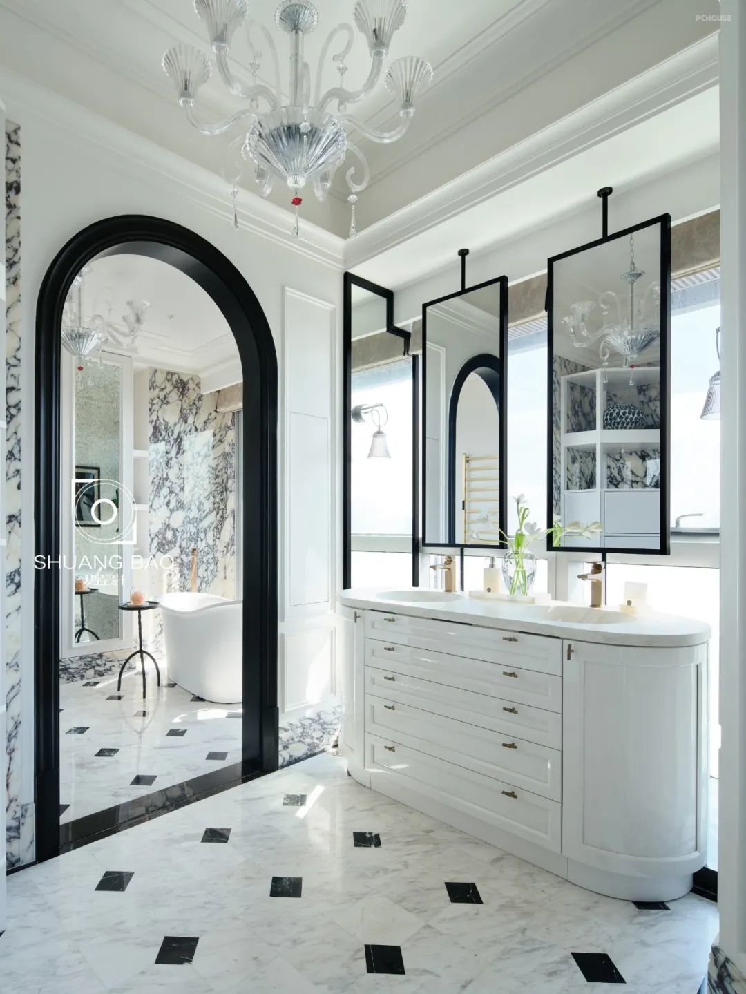 水晶吊灯、迷你壁炉、香薰灯,让私密的卫浴空间倍显极致仪式感,超越了基础实用功能,以松弛与精致兼具的姿态,诠释与自我独处的庄重感。这份自洽不仅源于物质层面的满足,更来自精神层面的愉悦。在此,褪去外界赋予的多重角色,只与自我温柔相拥,卸下一身疲惫,重新唤醒对生活的热爱,沉浸于可贵的片刻静谧。