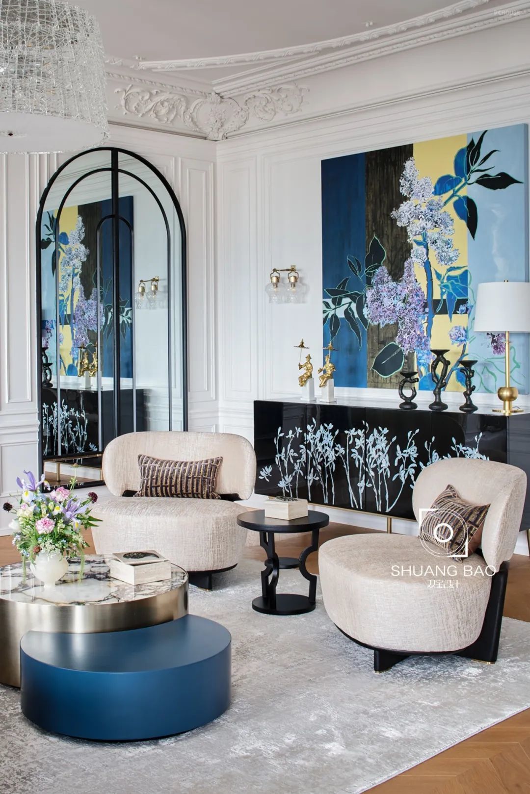 客厅里,花卉主题壁画格外醒目,淡雅古典气息扑面而来。画作中宝蓝、黑色、浅黄、浅蓝的背景色块,与沙发茶几、边柜及桌面金属摆件等相互呼应,让整个客厅用色虽繁却不杂乱,形成丰富且统一的色彩体系。我们特意定制漆柜,以大漆螺钿工艺绘制鎏金花卉,随自然光影流转,展现出虚实交融的立体视觉效果。