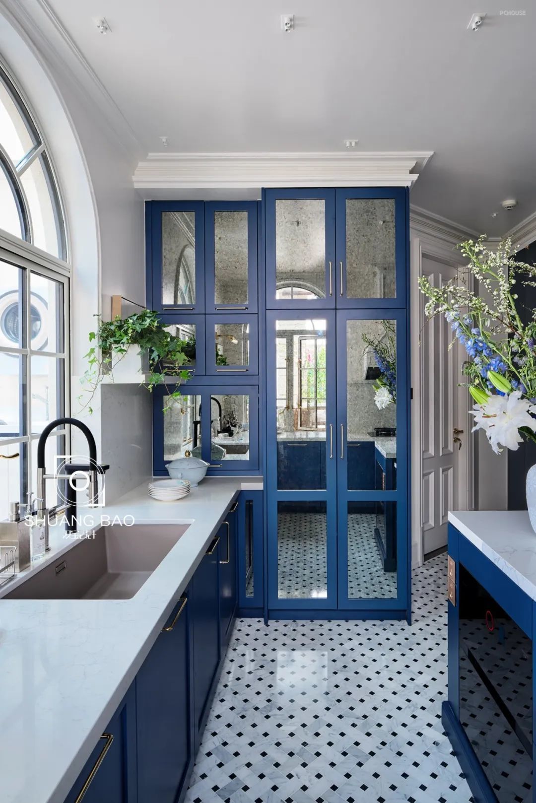 永生花意象经美学转译,让花影永驻家中。不过女主人仍会不时添置鲜切花,让家中花姿愈发丰富鲜活,户外的自然花香同样不可或缺。以蓝白为主色调的中式厨房设有一扇采光窗,它同时充当户外餐厅的传菜通道,实现烹饪与用餐场景的自然过渡。这扇洒入光影、携来花香的窗,是被匠心布置的角落,隐匿于充满烟火气的日常生活中,增添一份独特的精致。
