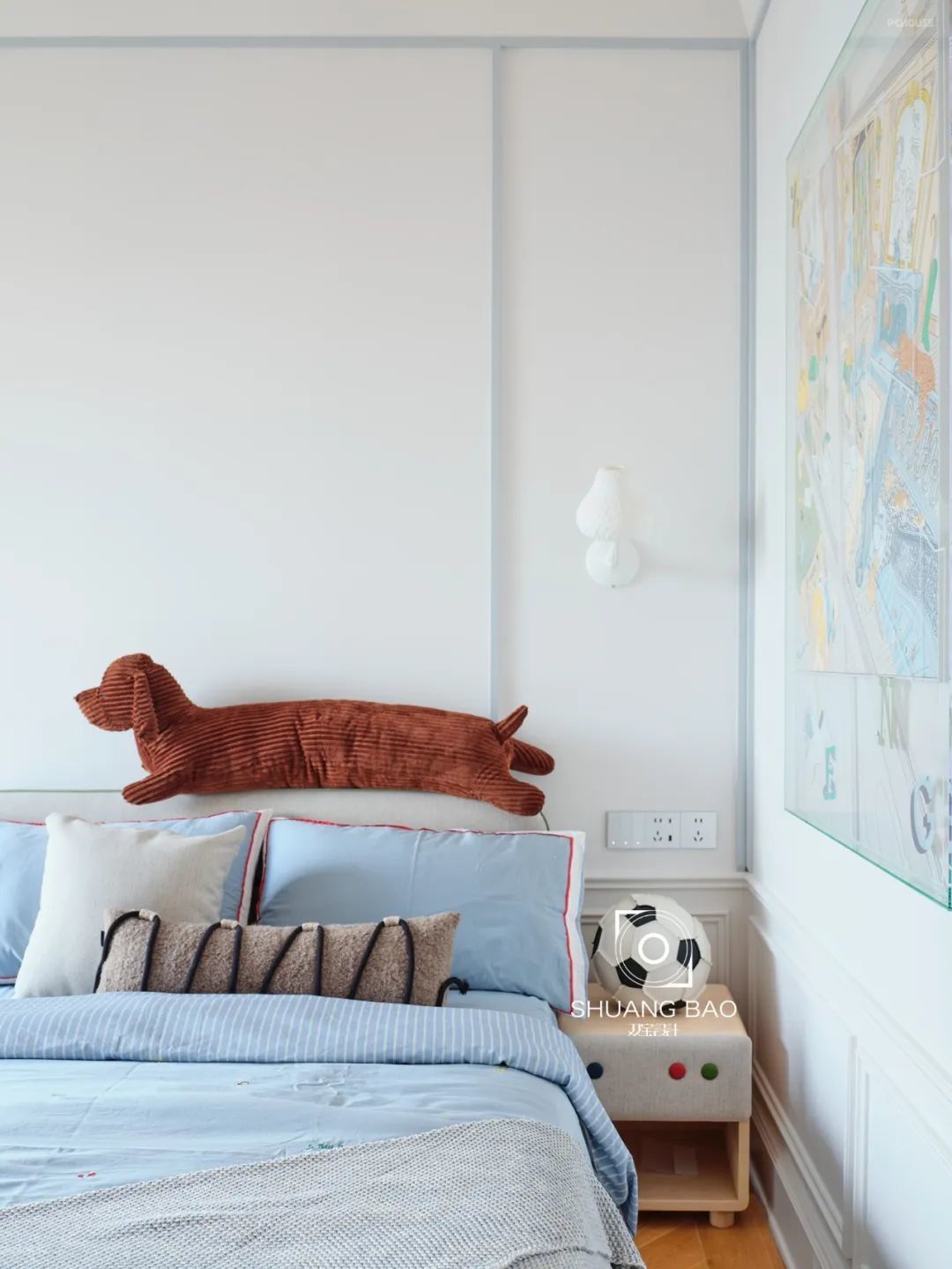 而两个儿子活泼好动,喜爱探索,他们的套房选用清爽大海蓝,蓝色的墙壁搭配海洋元素的挂画与床品,仿佛将碧海蓝天搬进室内,带来清新自然的气息,打造出舒适又充满活力的居住空间。