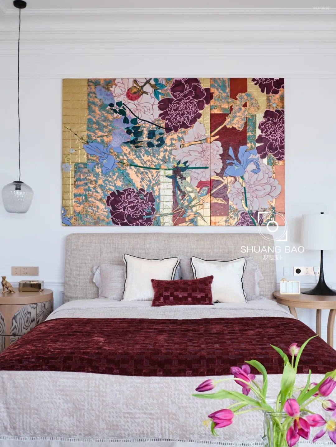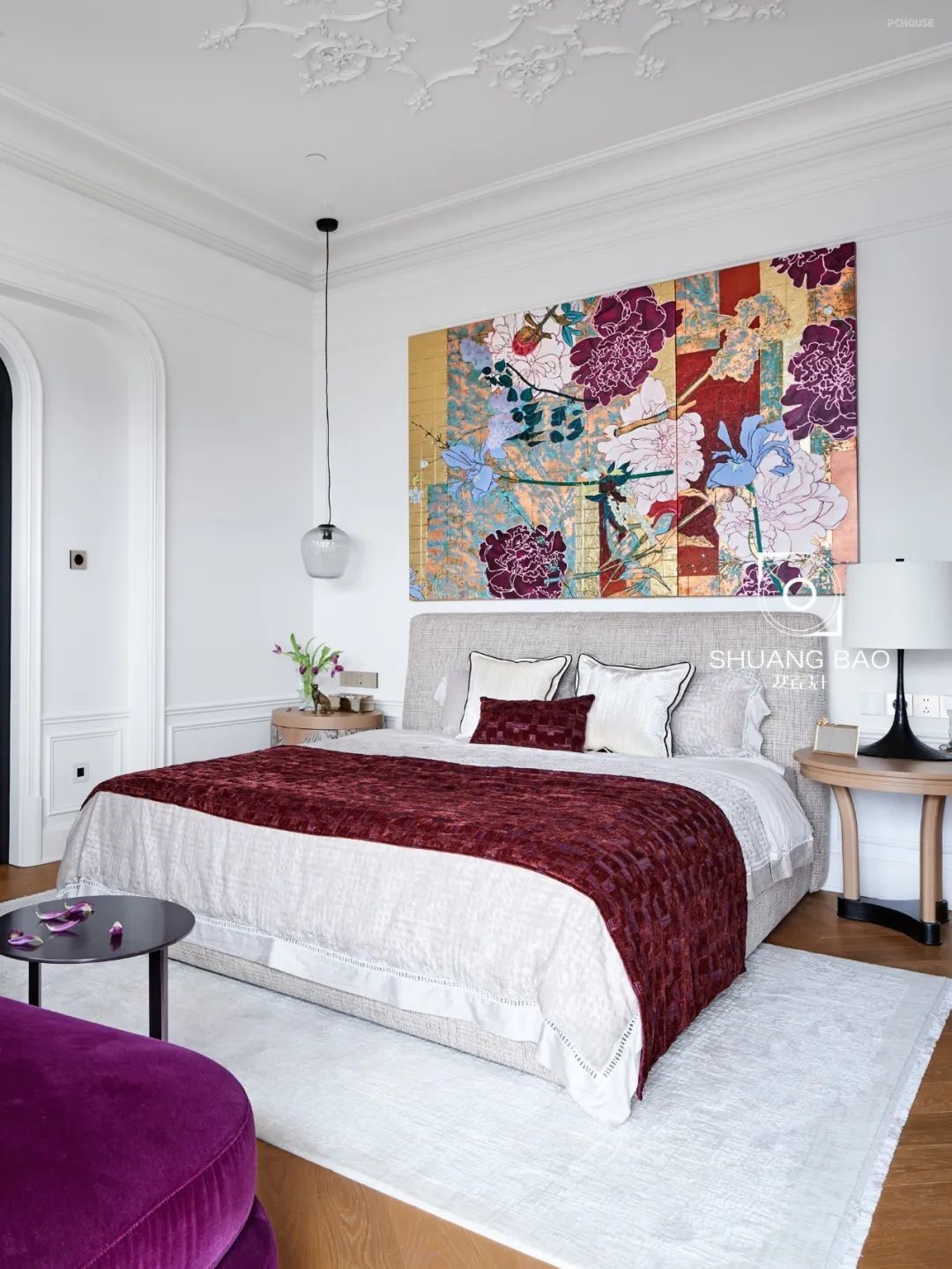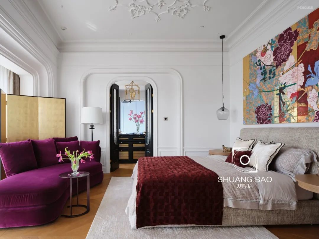 狭长艺术连廊尽头,法式双开门以仪式感开启主卧套间。相较于公共空间的黑白主色与清爽蓝色系,此处的紫红色调自显厚重华丽感。床头壁画延续永生花意象的设计巧思,却比客厅用色清冷的花卉壁画更显热烈张扬。