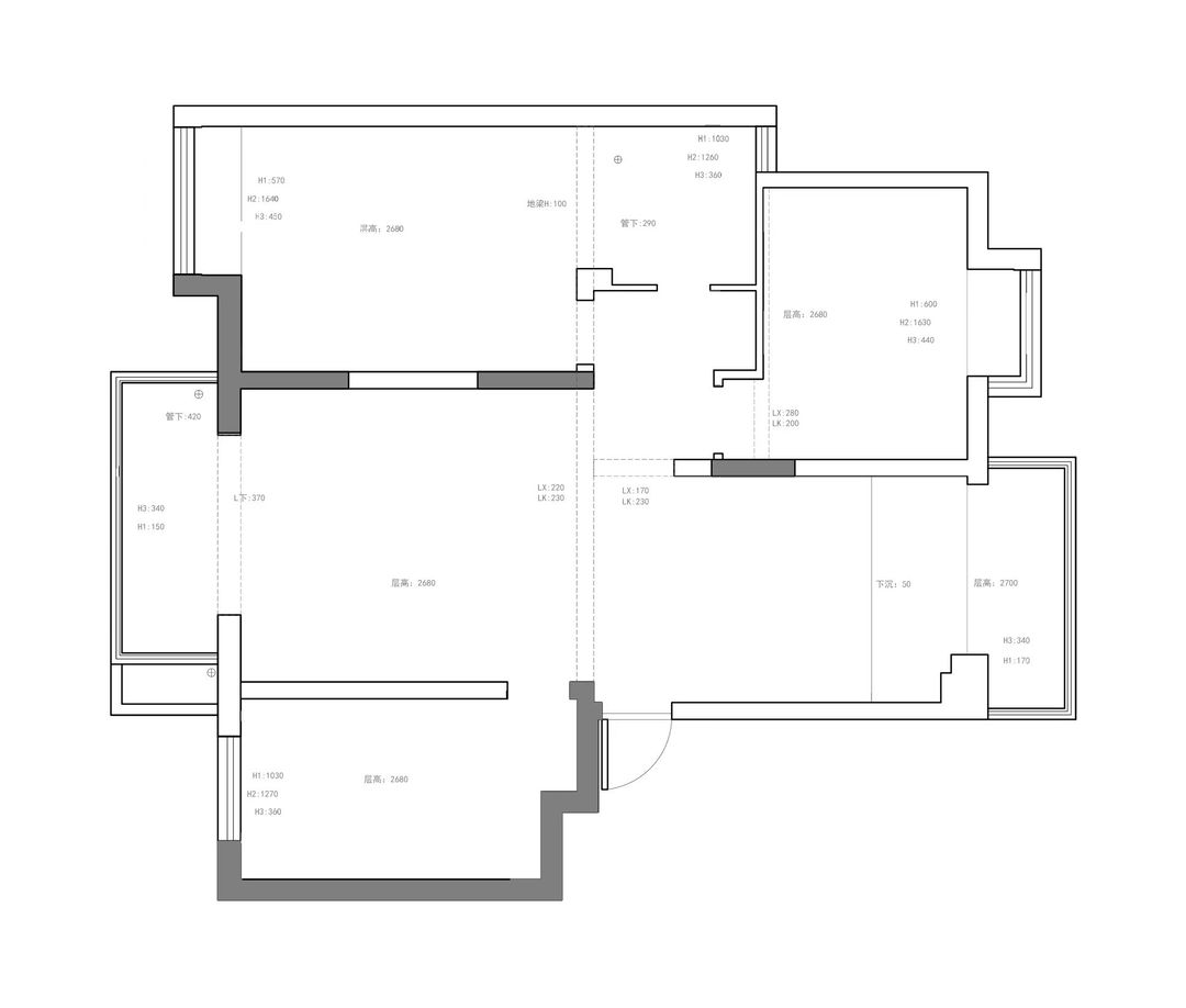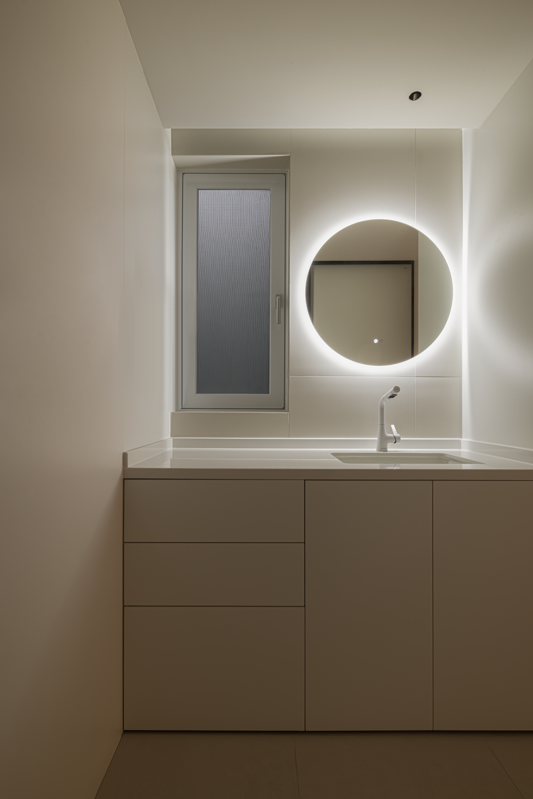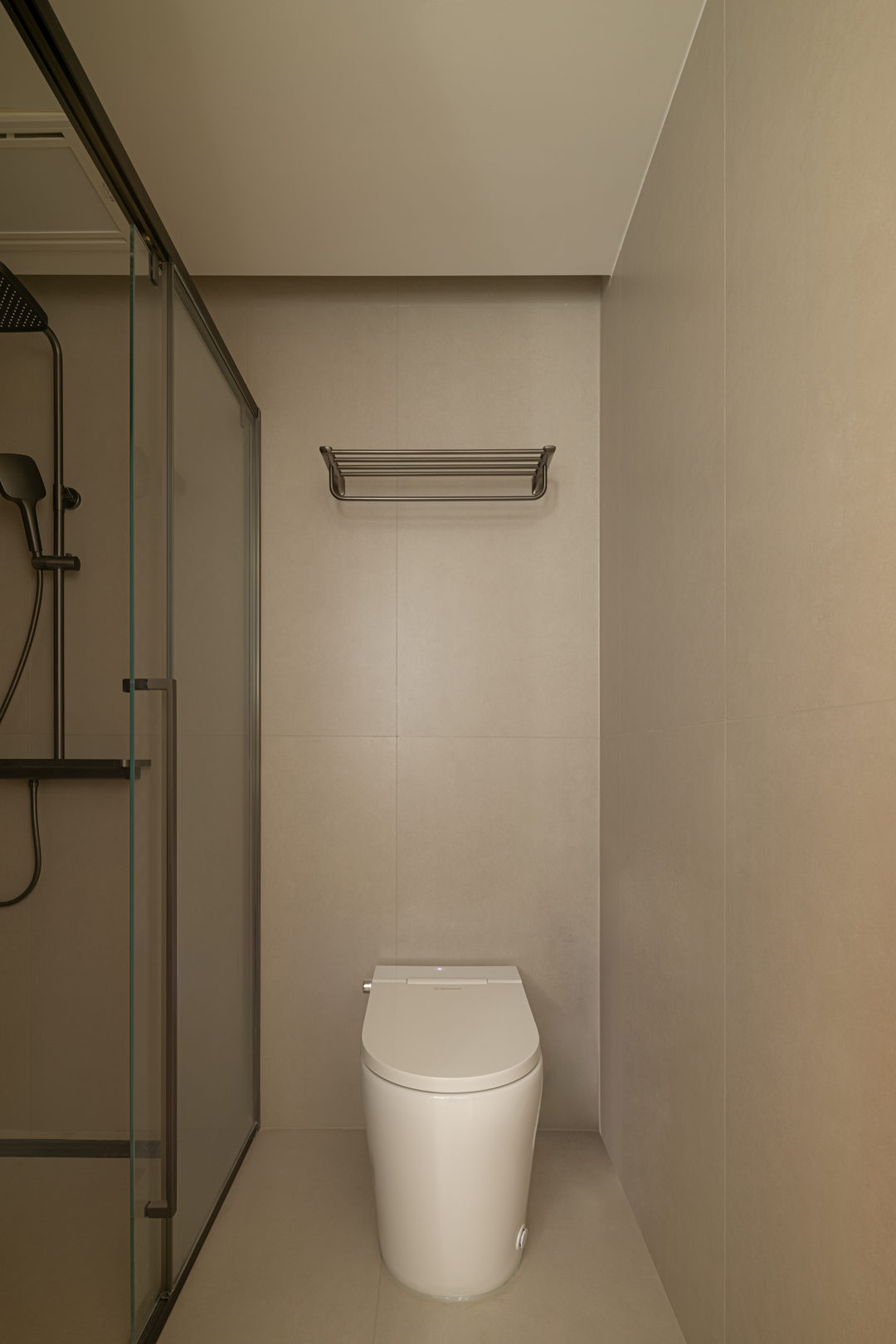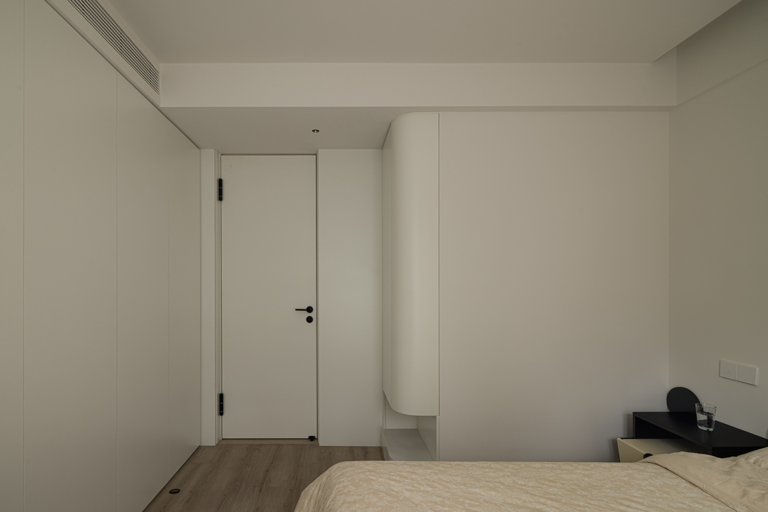 洗漱区与卫生间采用多分离式布局,将台盆外置,打破原户型开门即见卫生间的局促。以极简纯色为基底,借统一的色调弱化视觉干扰。收纳、洗漱功能隐于利落线条与无缝柜体。“隐形设计”让美学与实用相融。优化后的布局既解决原始户型弊端,又营造出治愈高级的居住氛围 ,从大门口望向洗漱区,动线与视觉体验均更显从容。