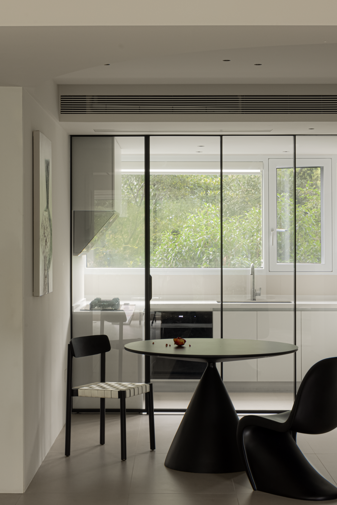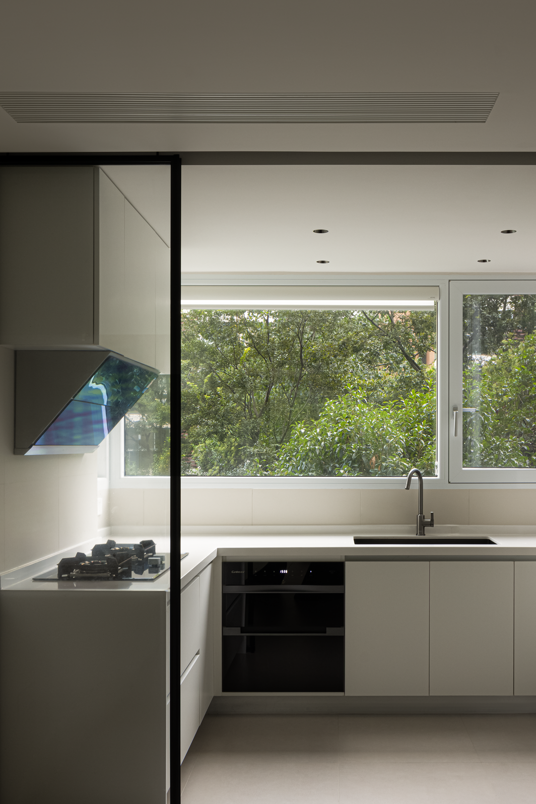 大面积窗户沿灶台延伸至空间另一端,窗外天光与绿意倾泻而入,把自然生机融入下厨与用餐场景,让日常烟火气也沾着清爽与诗意。