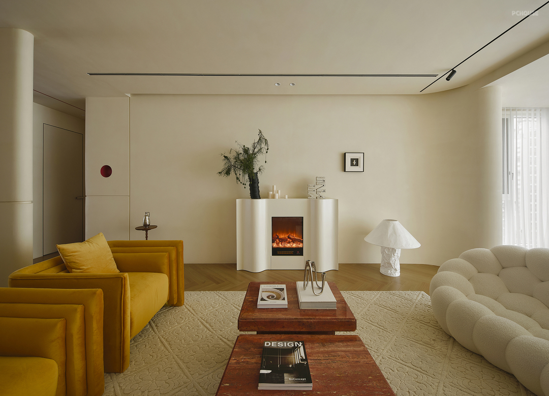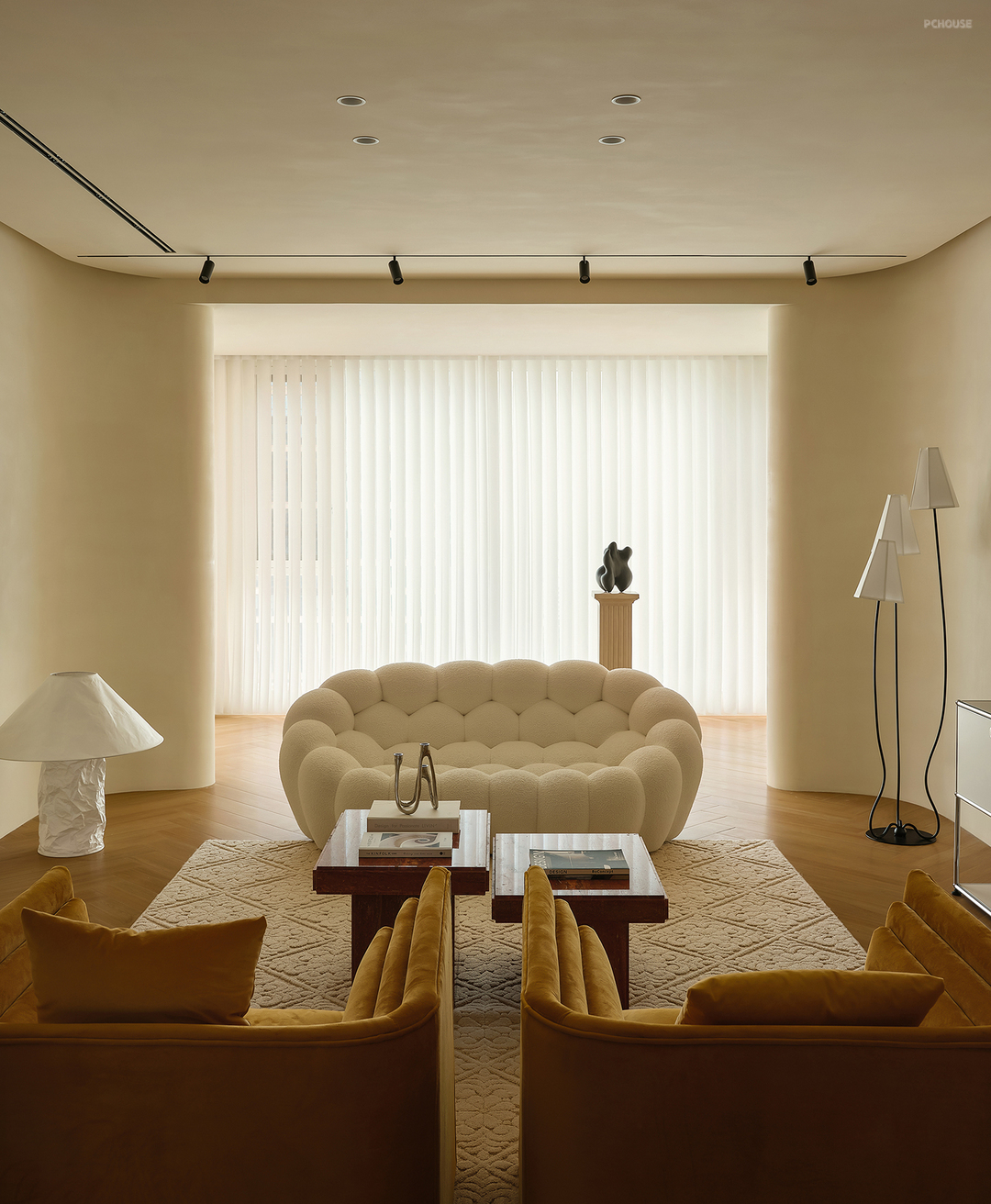 将阳台与客厅融合,通过两侧弧形墙面延伸进去客厅,使两者之间过渡更为自然。利用两侧空间布置钢琴和书桌,中间区域解放出来与沙发区域呼应。
