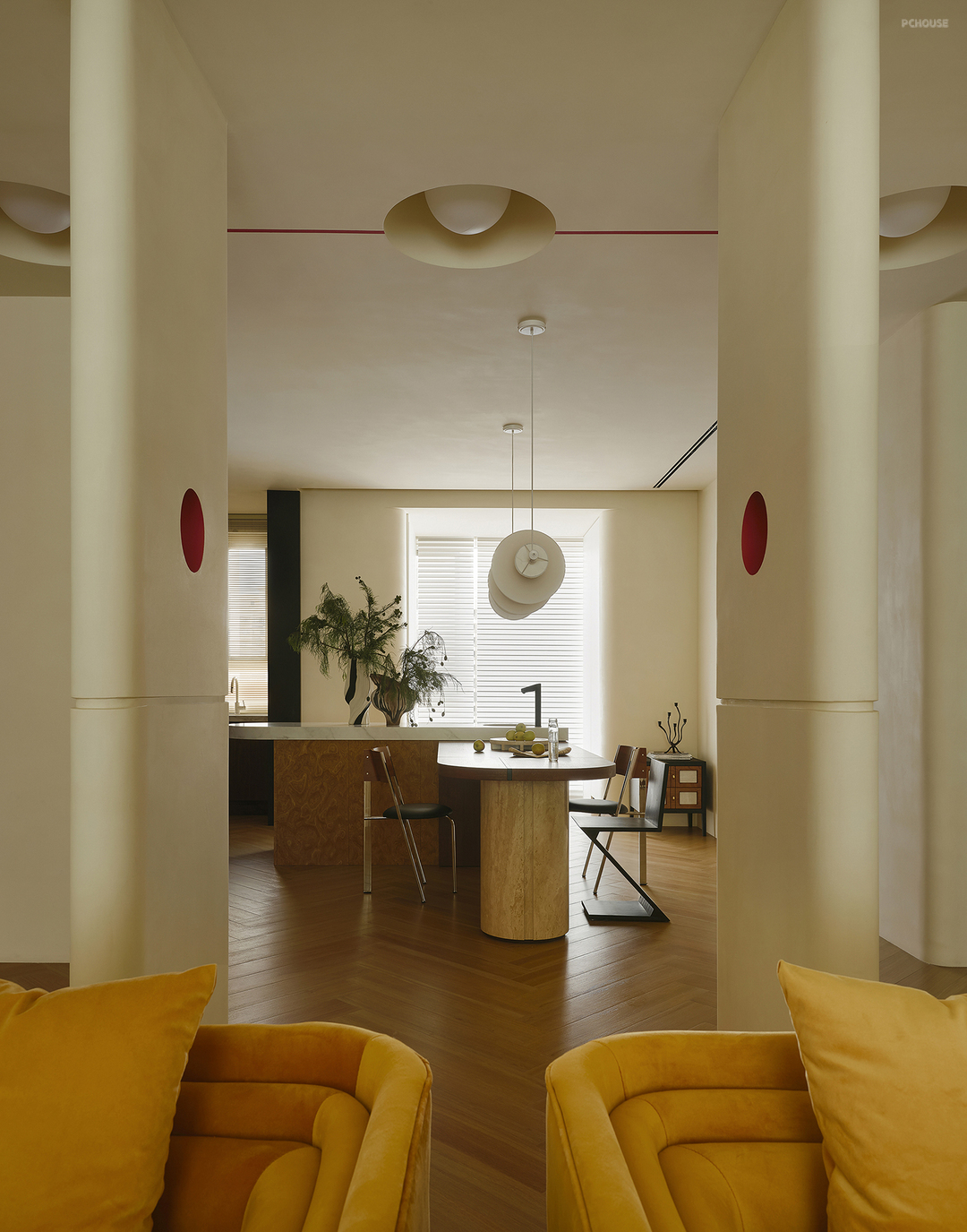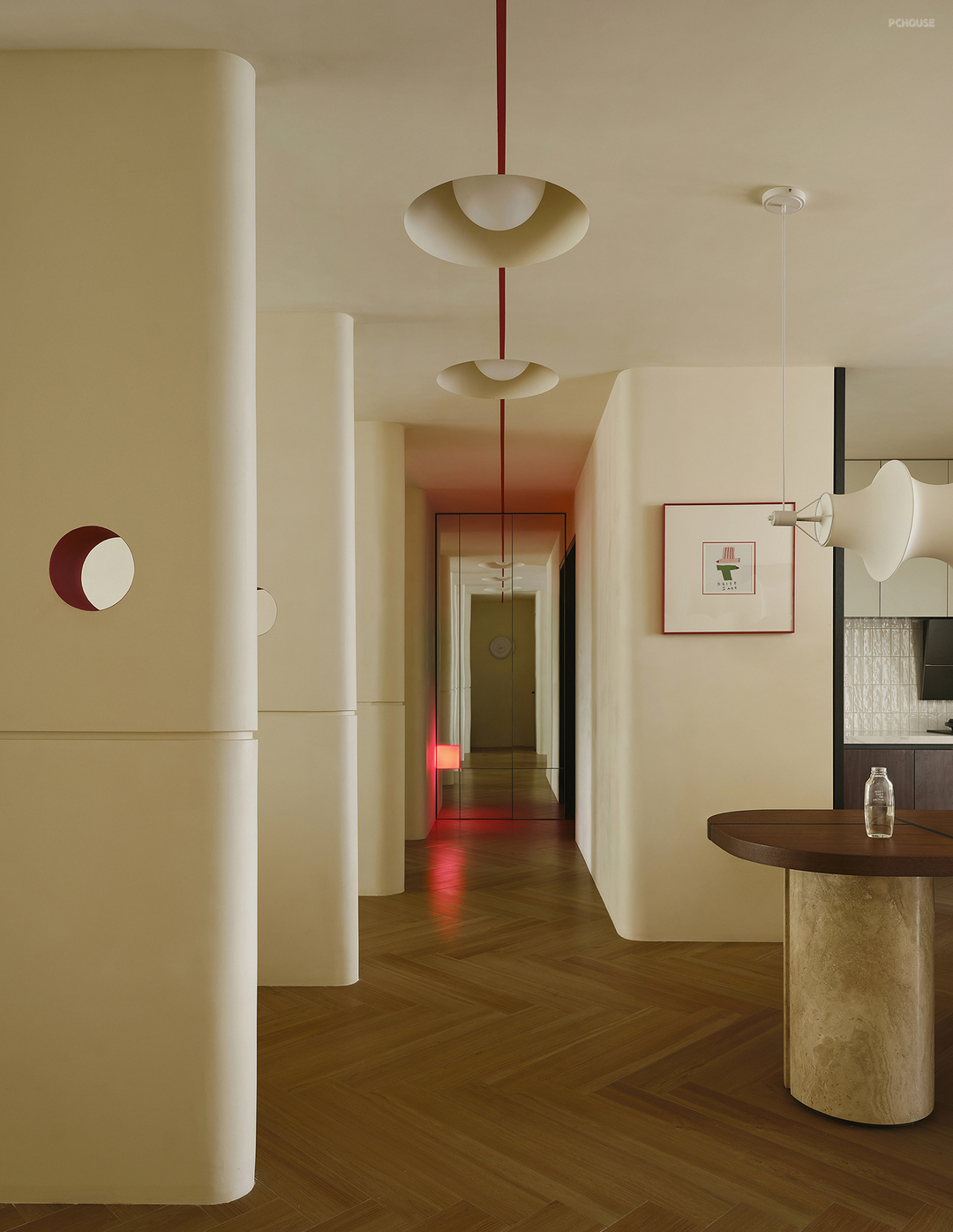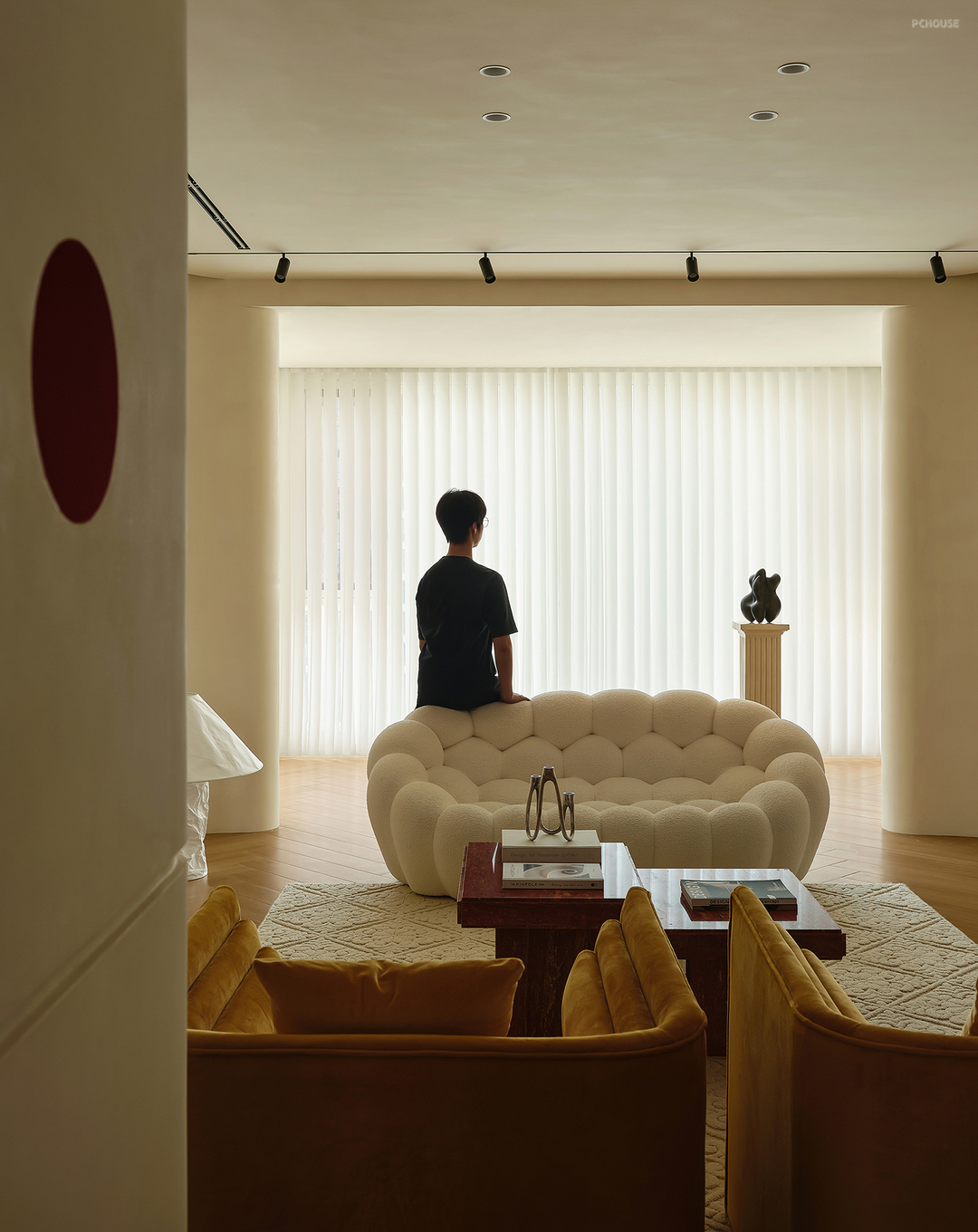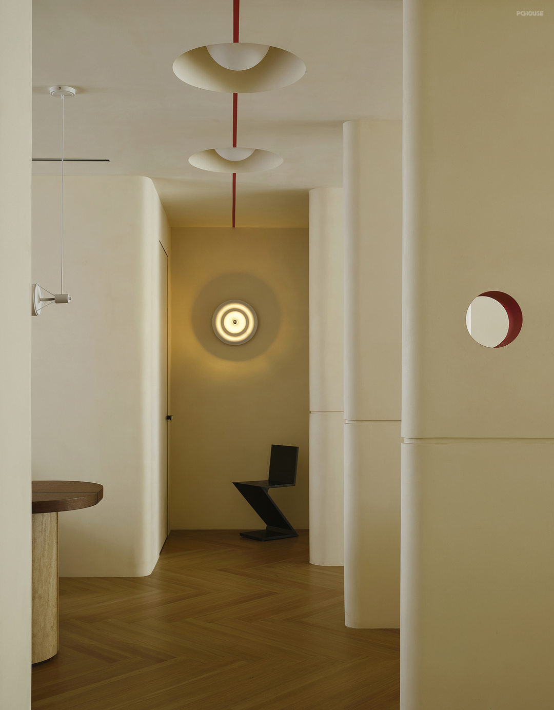 通过重复阵列的结构关系,打破空间一贯的沉稳,开阔视线下结构的多样性,色彩的关联性,让整个空间更具仪式感和趣味性。光影透过结构演变出更多的形态,给居住者留下无限的想象空间。