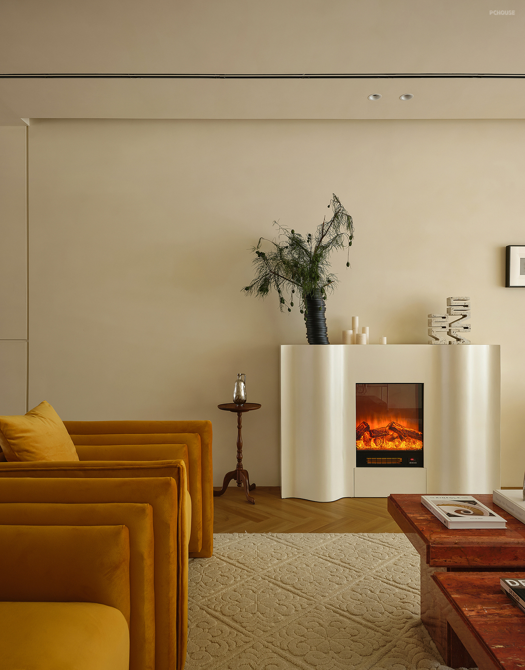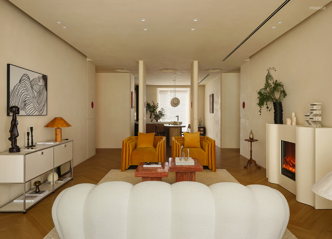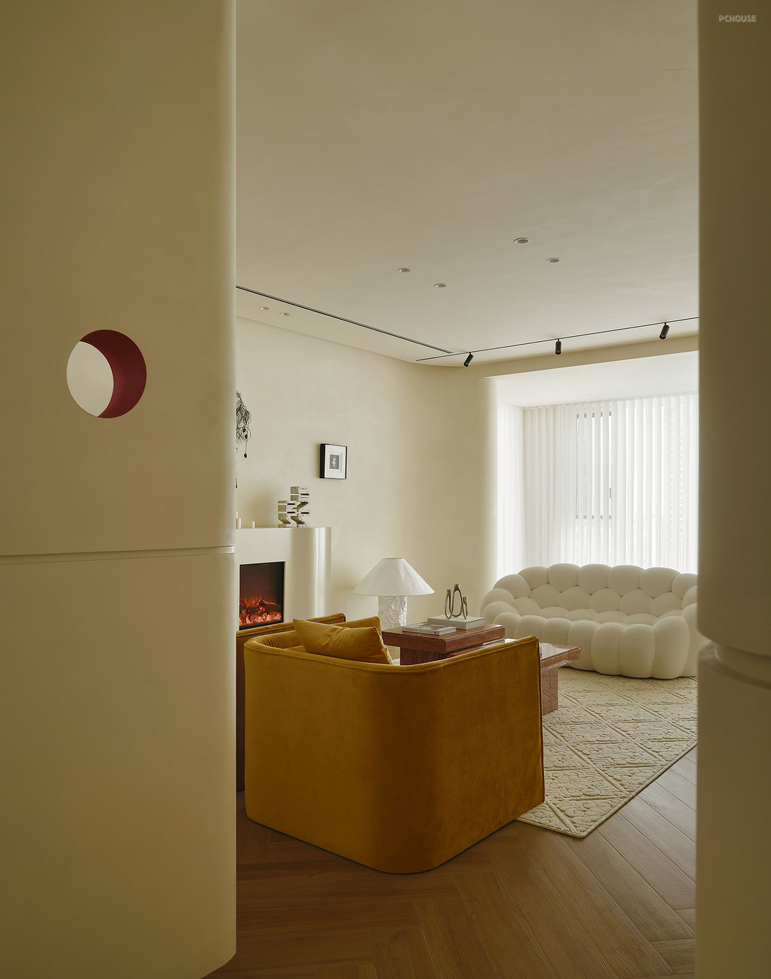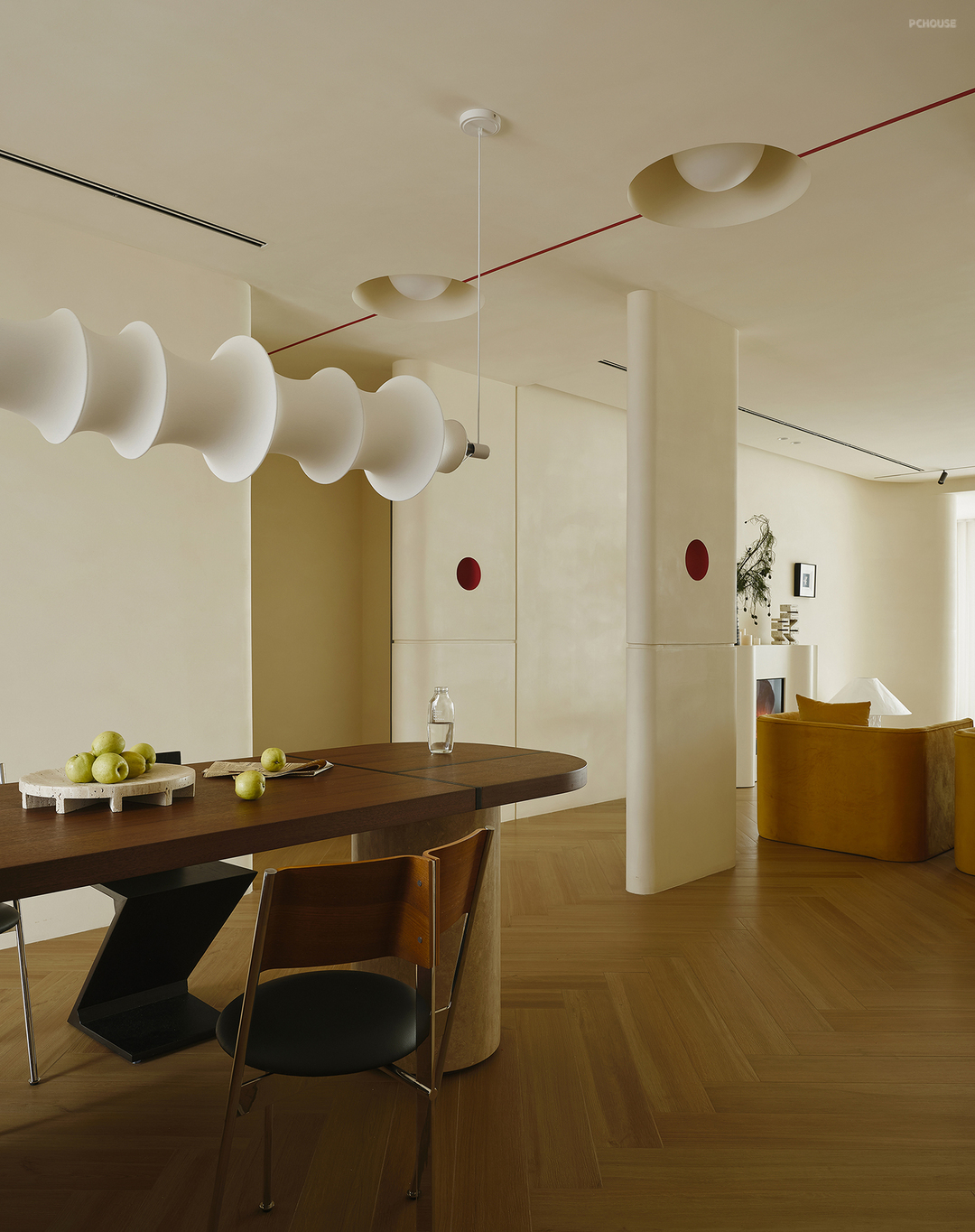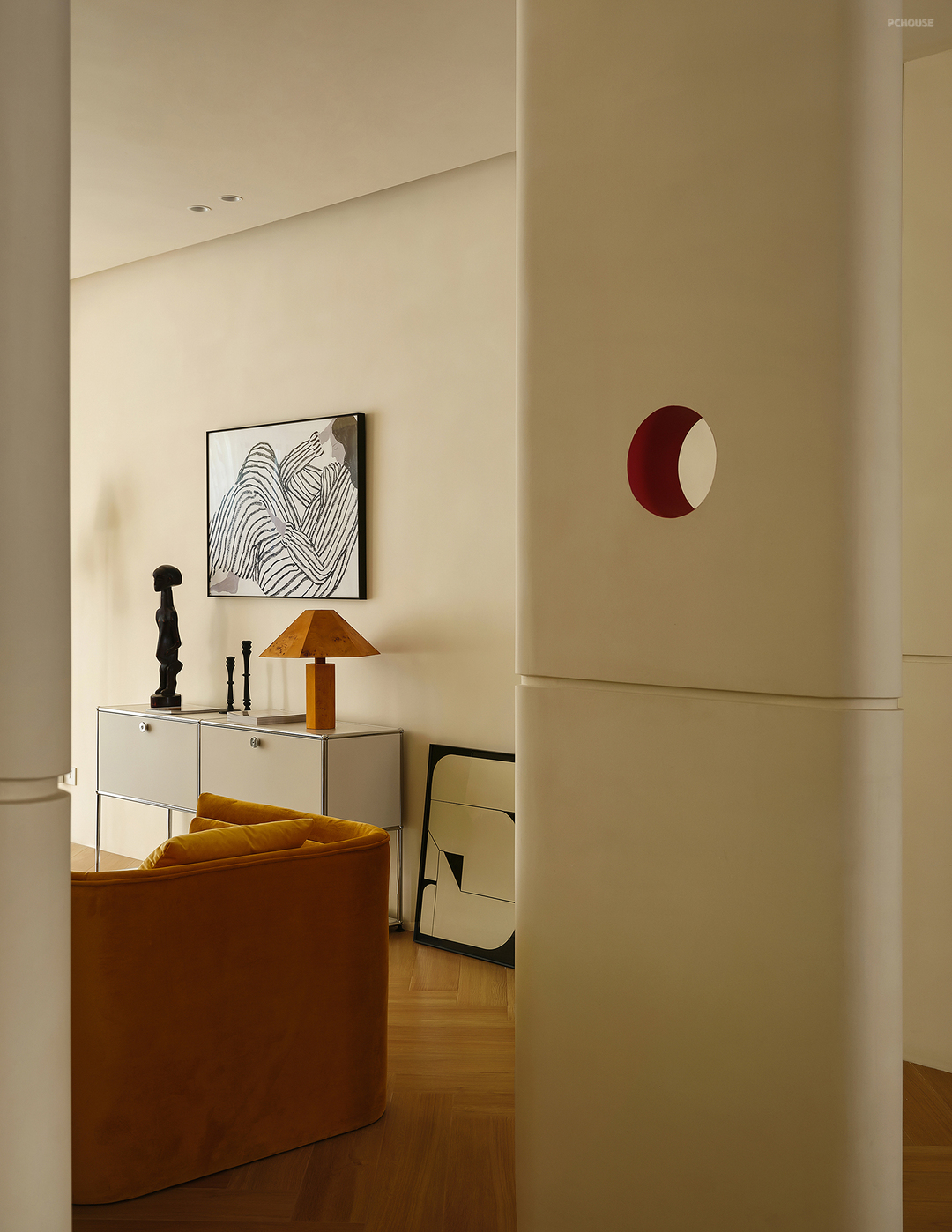 通过重复阵列的结构关系,打破空间一贯的沉稳,开阔视线下结构的多样性,色彩的关联性,让整个空间更具仪式感和趣味性。光影透过结构演变出更多的形态,给居住者留下无限的想象空间。