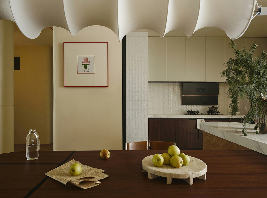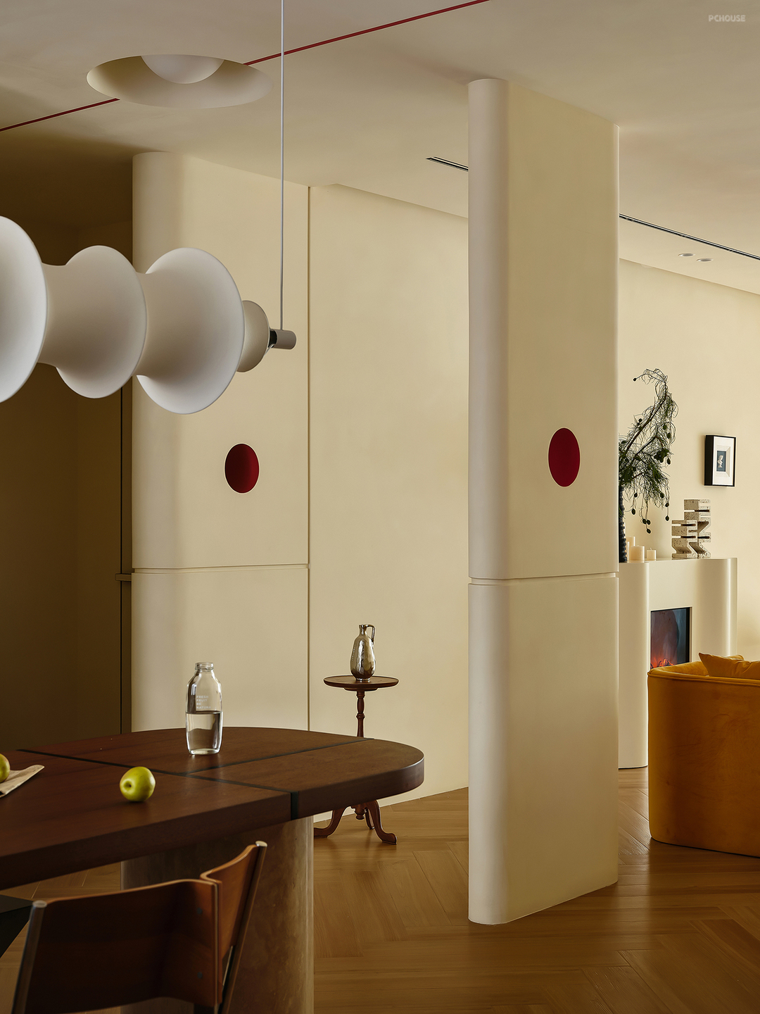 原有客餐厅之间的过道形式上相对单一,通过增加两个装饰墙体与两侧承重墙形成阵列关系,强调过道区域的同时也增加一些空间仪式感,同时将进门区域的视线自然的引导过来。墙体之间形成3条洄游动线,增加空间的趣味性,使用者之间的互动性也得到提高。