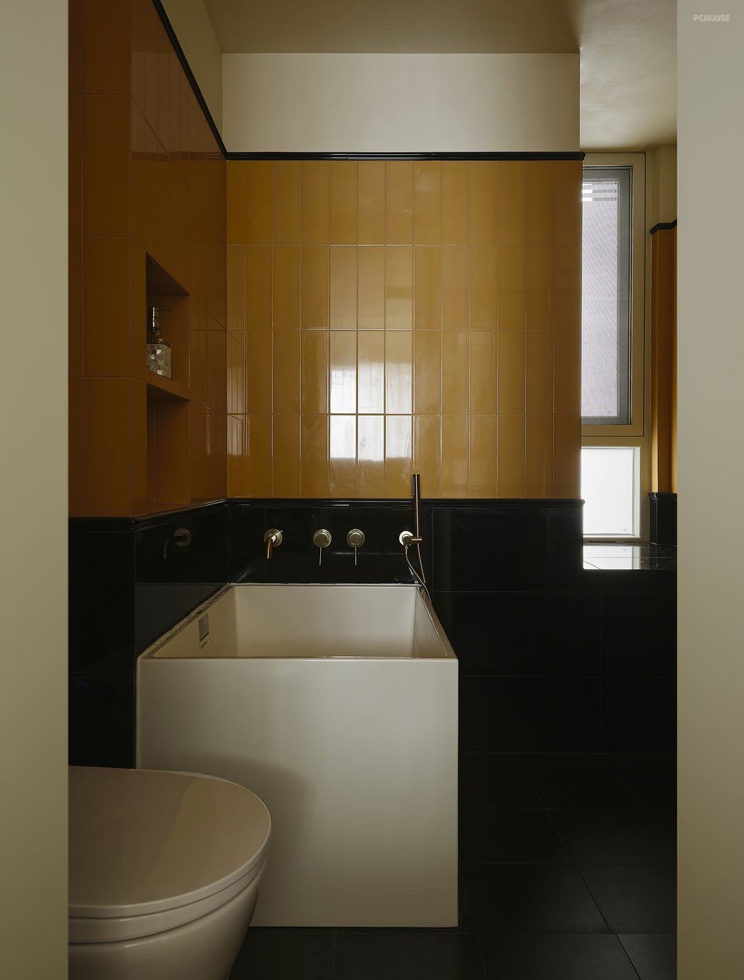 主卫重新布局,将入口处暗藏于衣柜中间,使主卧的动线更加干净。保留基本功能的前提下增加迷你浴缸。