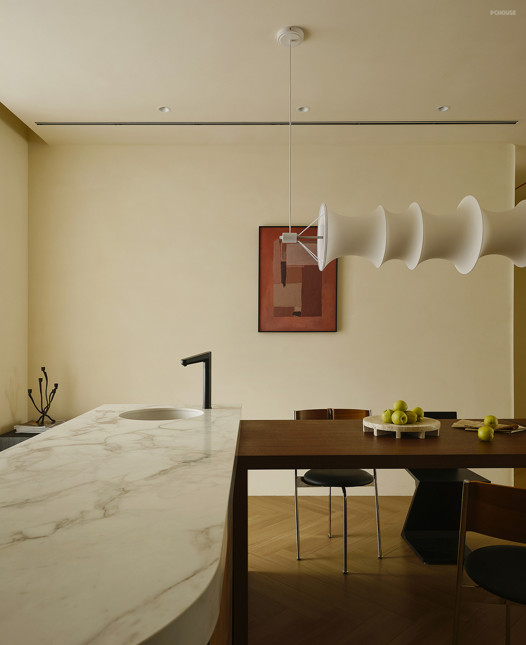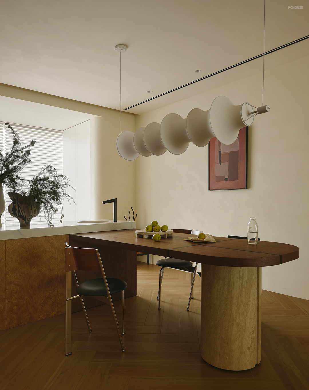 餐厅作为整个空间的枢纽,承载了一家人的一日三餐。为了满足用餐舒适性将2米长六人桌与岛台相结合。岛台延伸进入厨房,设置水槽和嵌入电磁炉,同时岛台也兼备早餐区域。