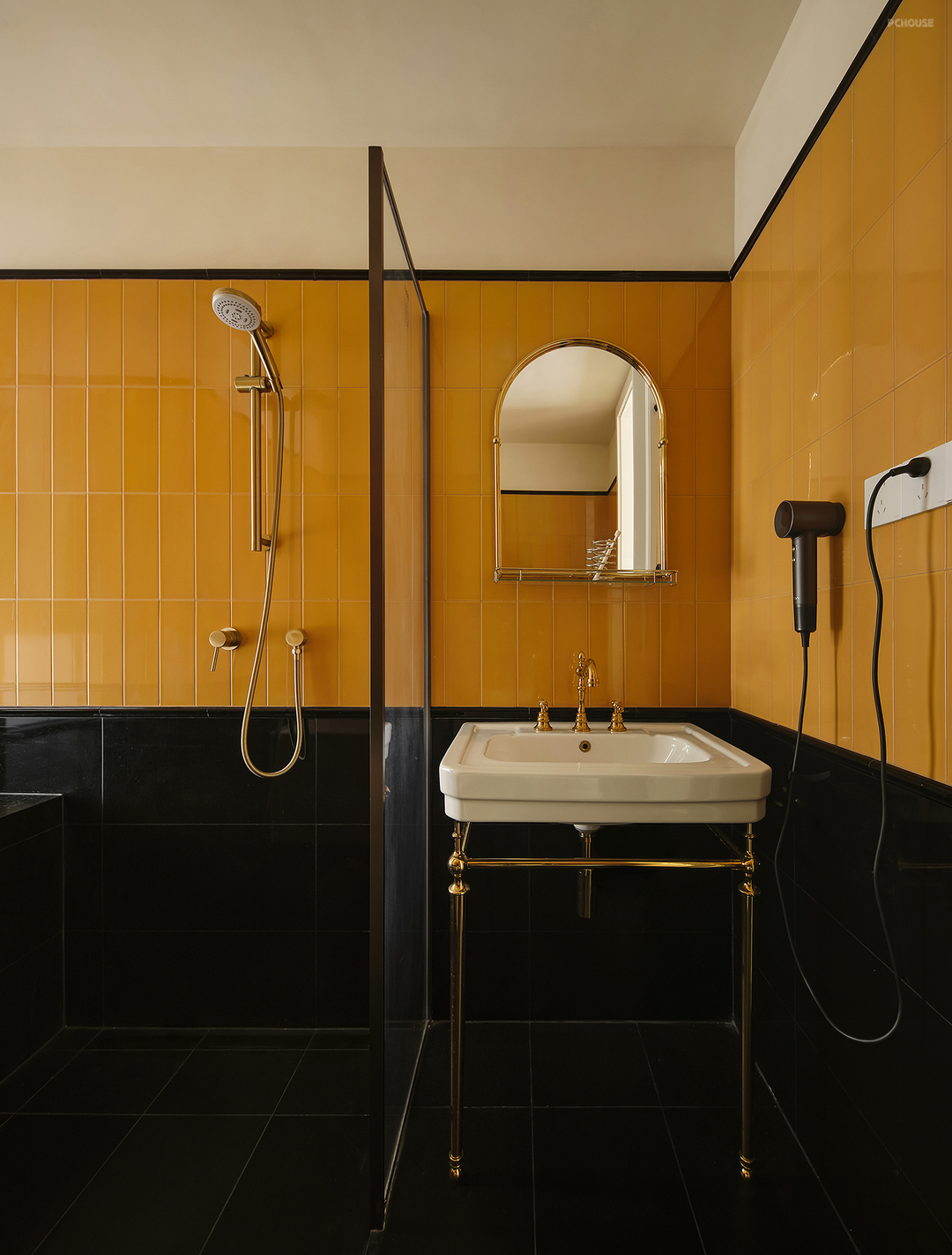 原有客卫暗卫,通过将台盆外置于原有过道处,重新规划动线,压缩卫生间尺寸,且保留淋浴和马桶功能,并且在与过道之间的墙面保留采光窗。