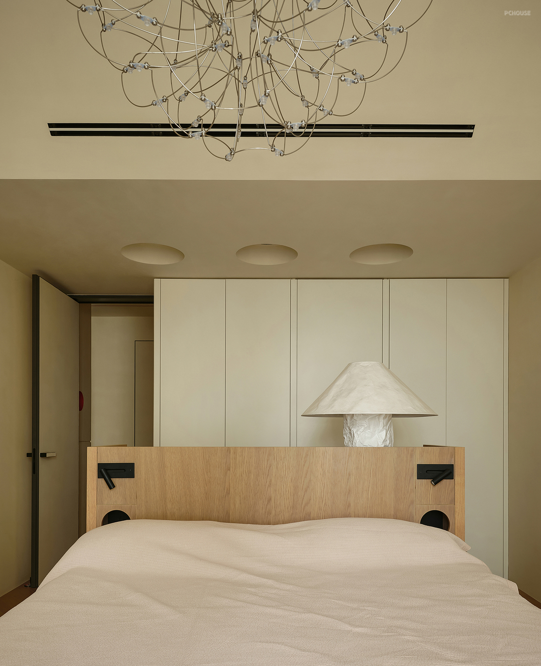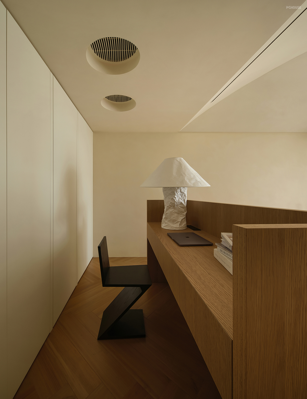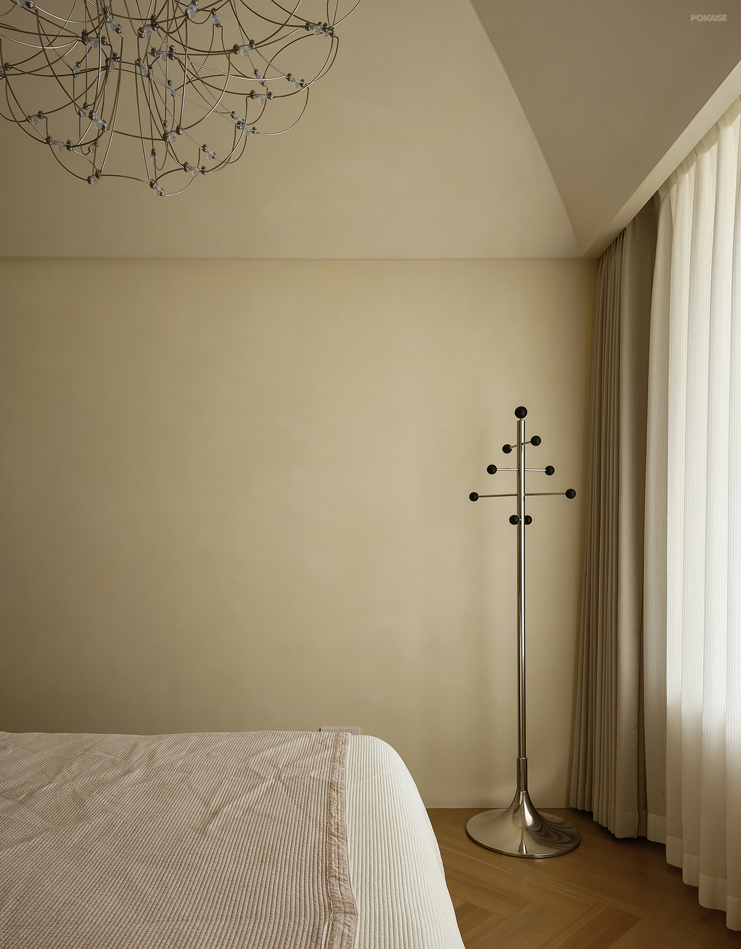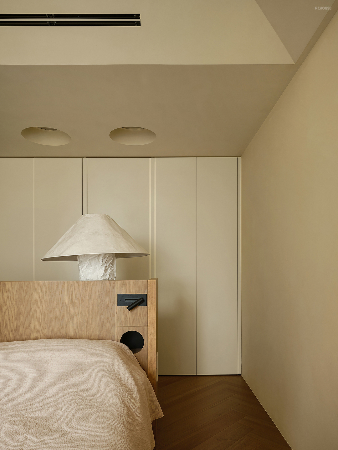 主卧室运用度假酒店的设计理念,将床头面朝窗户,背靠半高写字台,整体睡眠区域地面抬高,阳光自然唤醒,延续轻松惬意的空间氛围。