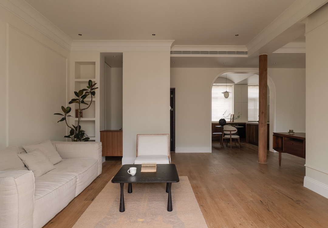 餐厅与客厅、书房以过道隔开,我们特意在三者交界处矗立了一根木质圆柱,它的体量是恰到好处的存在感,质朴的肌理感也带来几分随性。