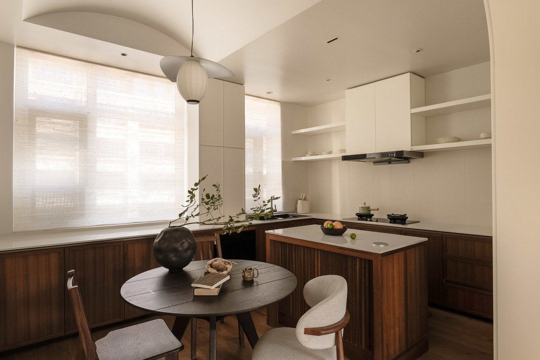 相较于宽敞的客厅,原户型的餐厨空间显得局促些,因此我们把厨房打开,餐区选择小巧的圆桌,满足使用的同时不占地方,全家人围坐于此时,心的距离也仿佛拉近许多。