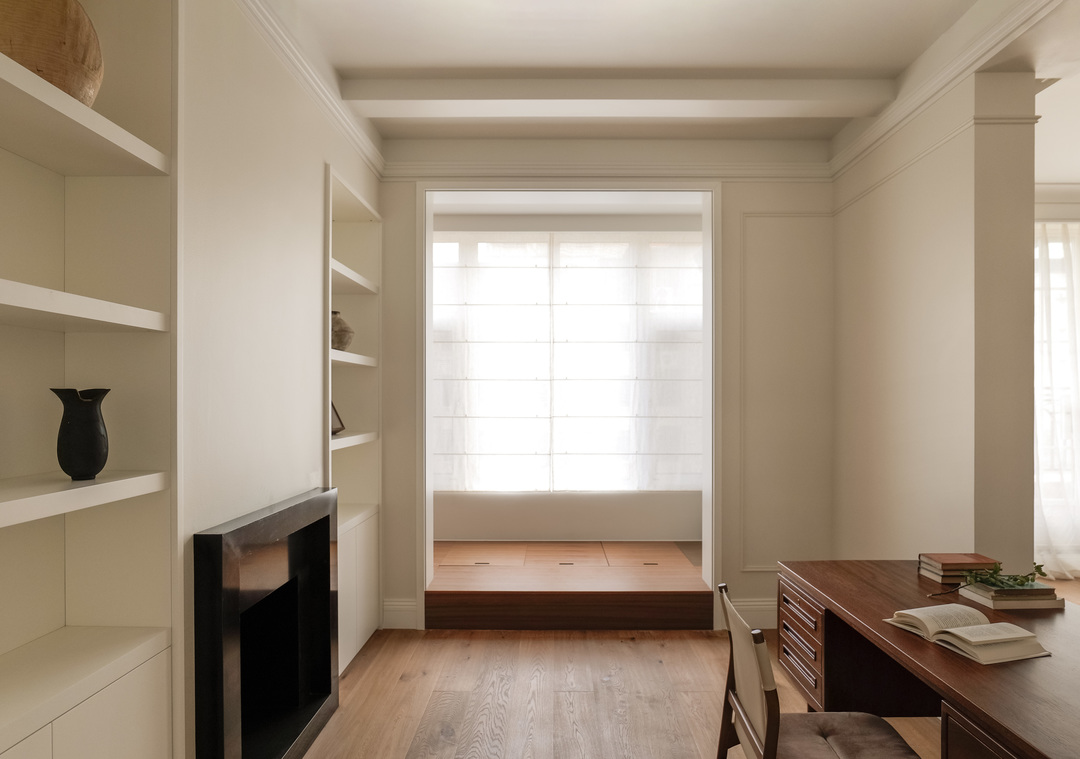 因此与客厅相邻的房间,我们拆除了非承重墙的部分,将其打通为开放式书房,与客厅视觉上连为一个更开敞的整体。