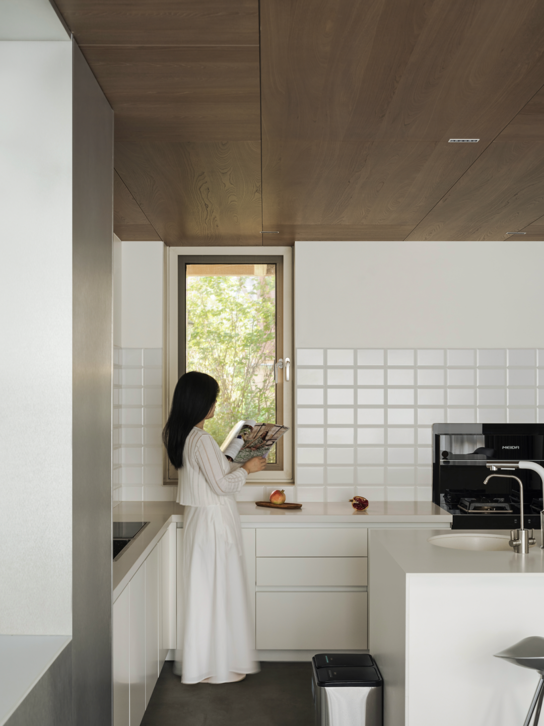 考虑到住户的日常需求,普遍使用的厨房吊柜被设计师改为嵌入式收纳柜,蒸烤箱、冰箱等家用电器均设置在符合方便操作的高度,避免住户爬高或频繁弯腰,这些隐匿的设计细节,让空间既契合当代审美,又充满了人文关怀。