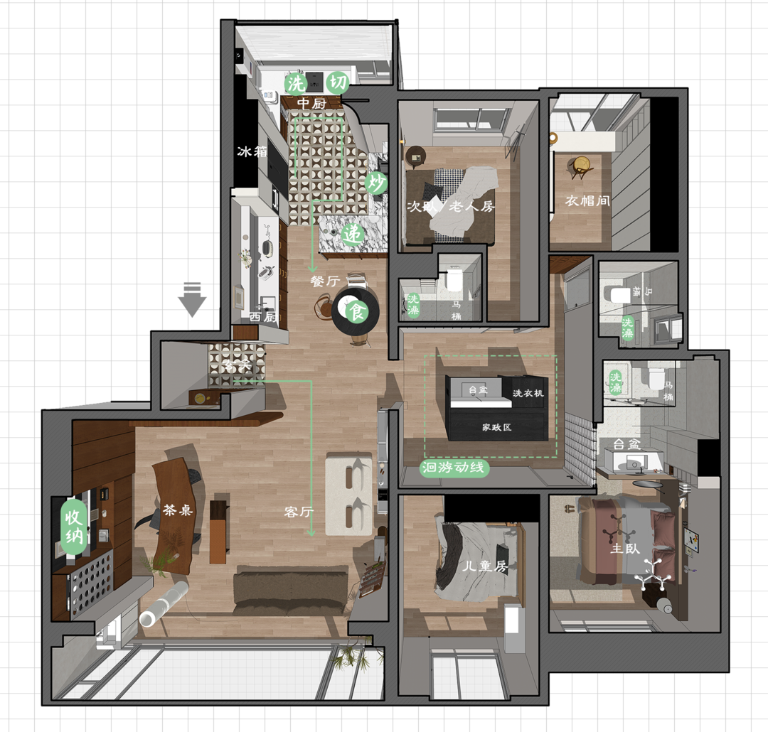 沿着这条动线,布置各个功能区,不仅打破了日常生活的呆板感,让房间充满生命力,还带不一样的居住体验。