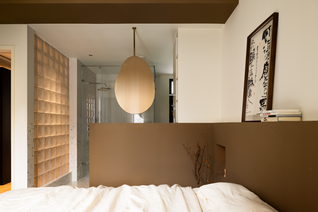 由于主卫仅供自己使用,采用了半开放式设计,扩展了空间感。吊挂的铜色异形镜子成为了空间的焦点,深棕色的乳胶漆与全屋风格相呼应。
