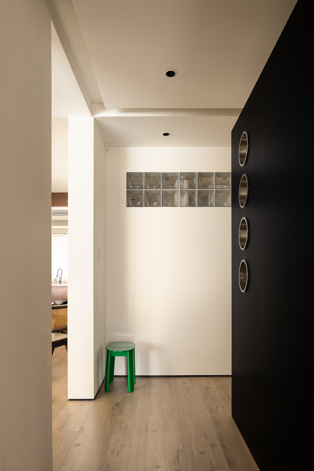 圆形不锈钢移门后,藏着男主人的心头所好。移门可随意开合,不仅巧妙解决了茶具的收纳问题,还成为空间中引人注目的设计亮点。